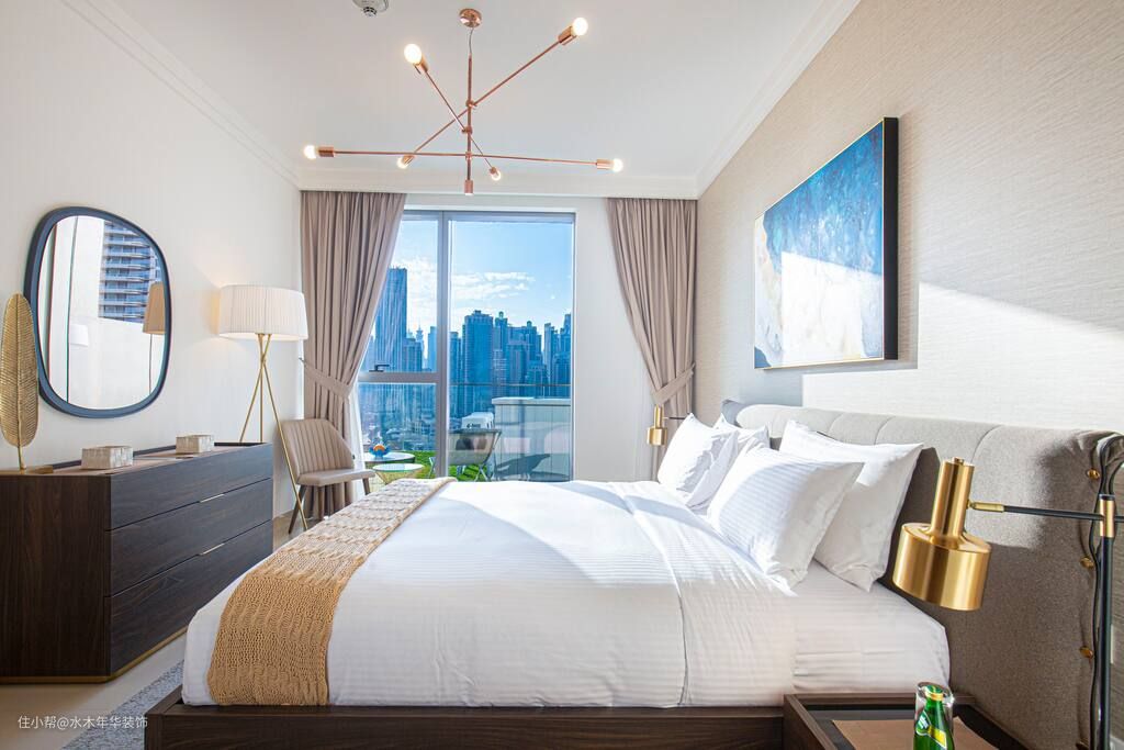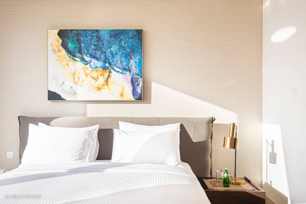 主卧看起来精致又时尚。背景墙铺贴了米黄色的壁纸,选用了抽象挂画做装饰,提升了空间的整体气质。清新明亮的蓝色调为卧室注入了活力。床头做了灰色软包设计,柔软舒适,既可以保护墙面,又为业主提供了更好的休息体验感。卧室的床头两侧设计了床头柜,上面摆放着台灯,满足业主局部采光的需求。床尾设计了收纳柜,台面可以摆放化妆品和护肤品,大尺寸的抽屉便于收纳袜子、内衣等物品。收纳柜上方设计了玻璃镜,便于业主美妆护肤。