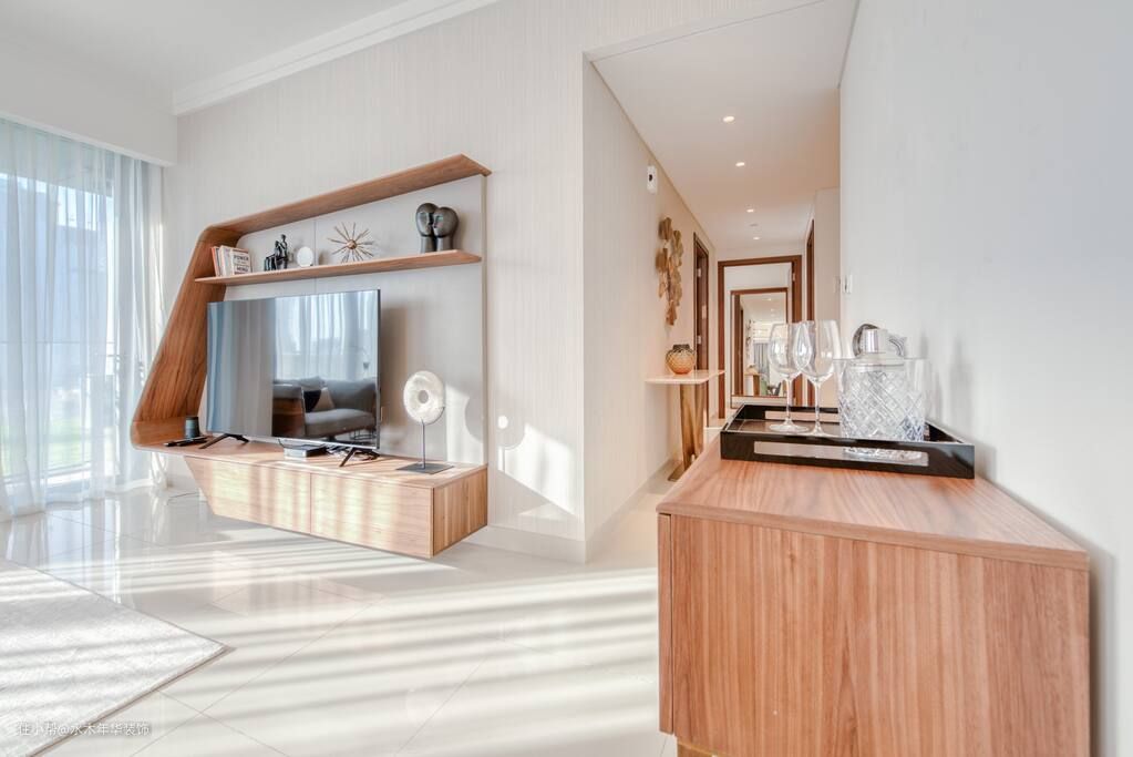 客厅采光充足,通透明亮。设计师在室内设计了白色的轻纱窗帘和厚重的灰色窗帘来遮挡强烈的自然光线,保护室内隐私的同时营造安静温馨的氛围感。白色的乳胶漆墙面搭配双眼皮吊顶,整体空间规整有型,层次感十足。米黄色的瓷砖通铺地面,干净又自然。待客区的沙发颇具特色,木质结构结合布艺材质,清新又舒适。为调和空间的厚重感,设计师选用了低矮的茶几,底座内缩,仿佛漂浮在客厅,轻盈又灵动。