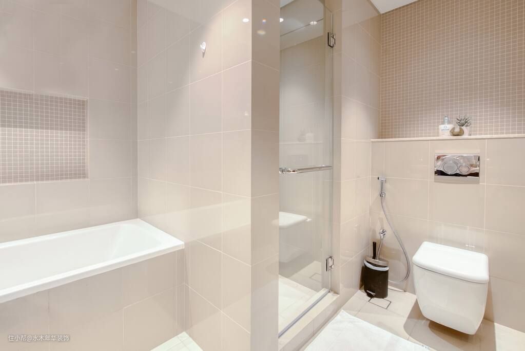 卫生间整体墙面铺贴了瓷砖,便于业主清洗水渍。地面铺贴了防滑地砖,保护业主的洗浴安全。卫生间满足了业主的个性化需求,设计了浴缸。设计师采用了玻璃材质做隔断,将淋浴区独立了出去,打造了干湿分离的洗浴空间。淋浴区一侧是如厕区,设计了壁挂式马桶,不仅防潮还能避免产生卫生死角,便于业主清理。