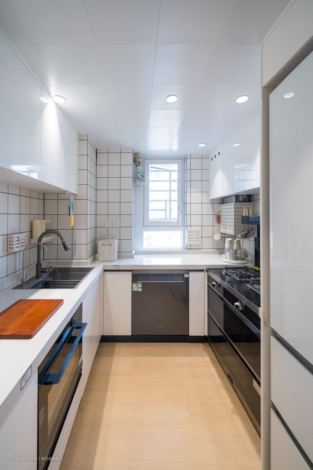 厨房的墙面均贴小白砖,一进门,小清新风扑面而来。在这样的空间里,做饭也充满温馨感,厨房门选择长虹玻璃门,透光不透人,白净美观。橱柜是一整个暖白色,连冰箱也是相似的颜色,搭配黑色发亮的餐厨用具,动线流畅,简约美腻~厨房台面十分整洁,用收纳架放置盘子,墙面做挂钩、隔板等各类收纳工具,这肉眼可见的厨房利器太可了!