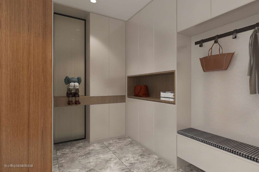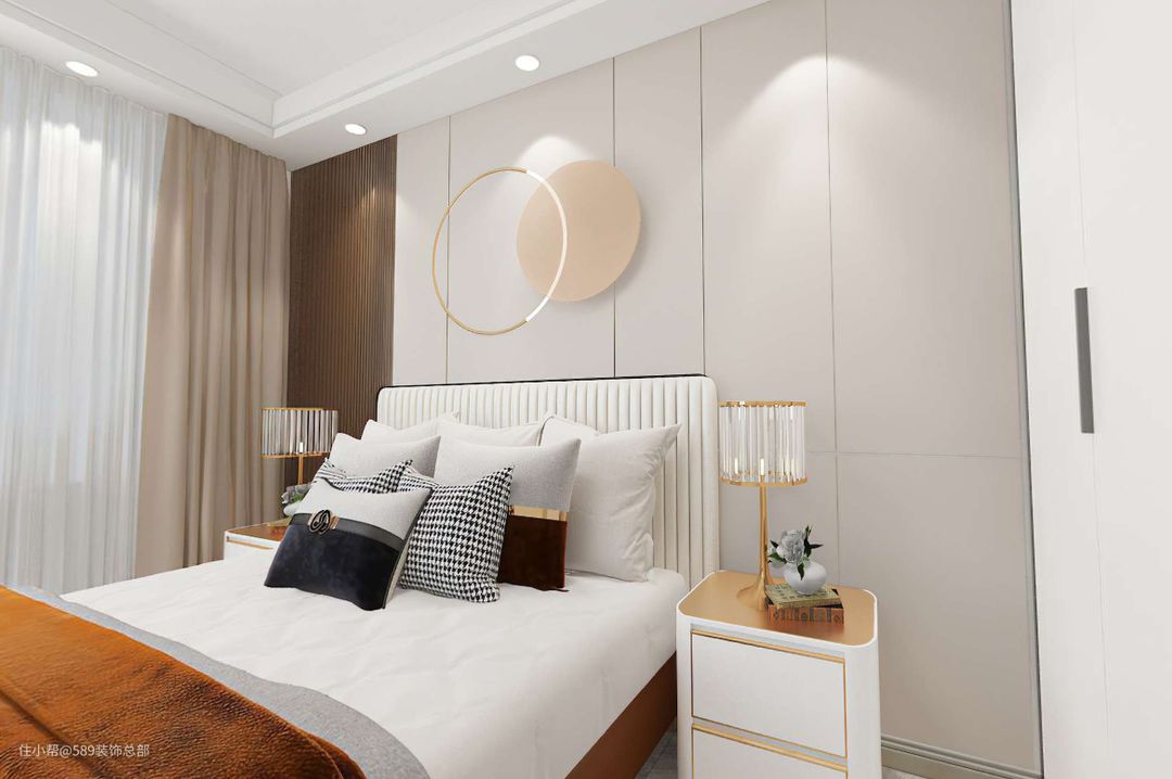 主卧主要色调为暖色调,进门就能感到温馨的氛围,床面背景墙选择不规则式设计,增加了空间上的设计层次感; 衣柜的到顶设计,相对于传统的衣柜收纳空间更足,美观性更强;