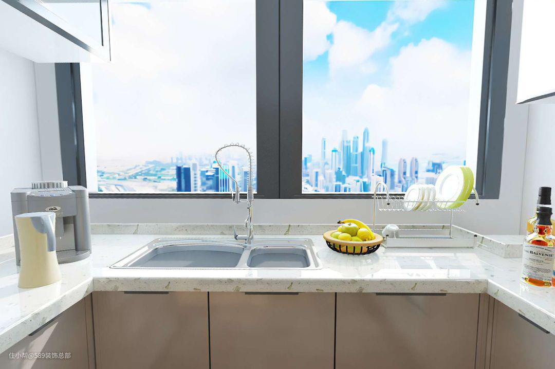 厨房为半开放式设计,利用玻璃推拉门进行阻隔,建议选择吊轨式推拉门,日常更好打理; 厨房内部做U型橱柜设计,增加适当合理的吊柜设计,满足日常厨具的收纳啊需求,空间上还不会显拥挤;