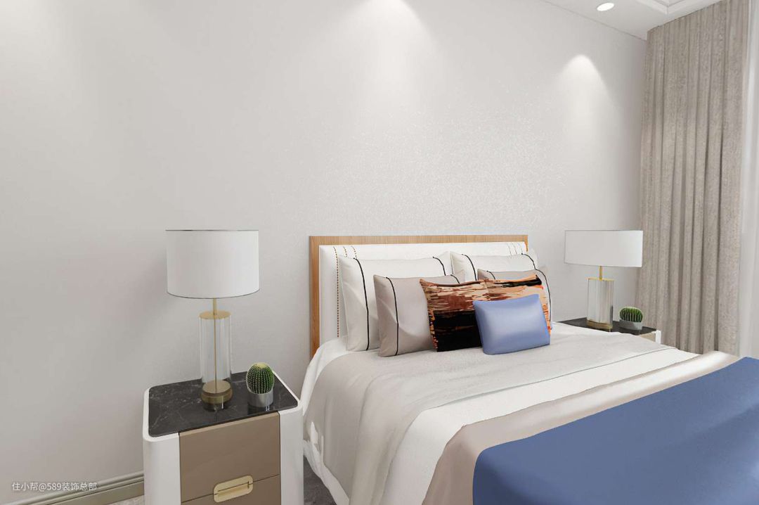 次卧简单设计,简单的吸顶主灯,加上吊顶处的筒灯设计,照明充足; 窗帘处选择窗帘盒的设计,相对于罗马杆窗帘遮光性更好;