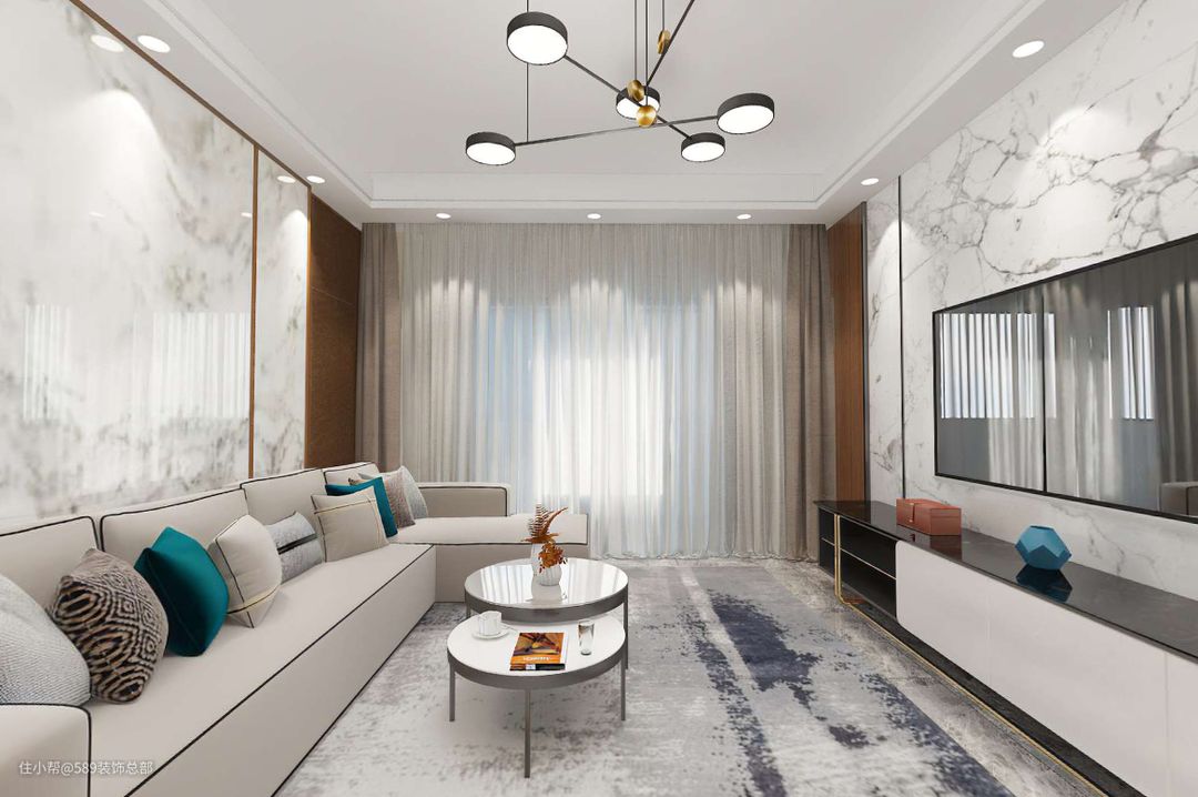 客厅地面墙面均采用瓷砖、岩板的设计,让整个空间显得更加通透,客厅地面铺地毯,增加温馨的氛围,加上不规则主灯的衬托,整个空间尽显温馨; 餐厅处空间不大,定制简单的餐边柜,选择地柜和吊柜的结合,更加有层次感;