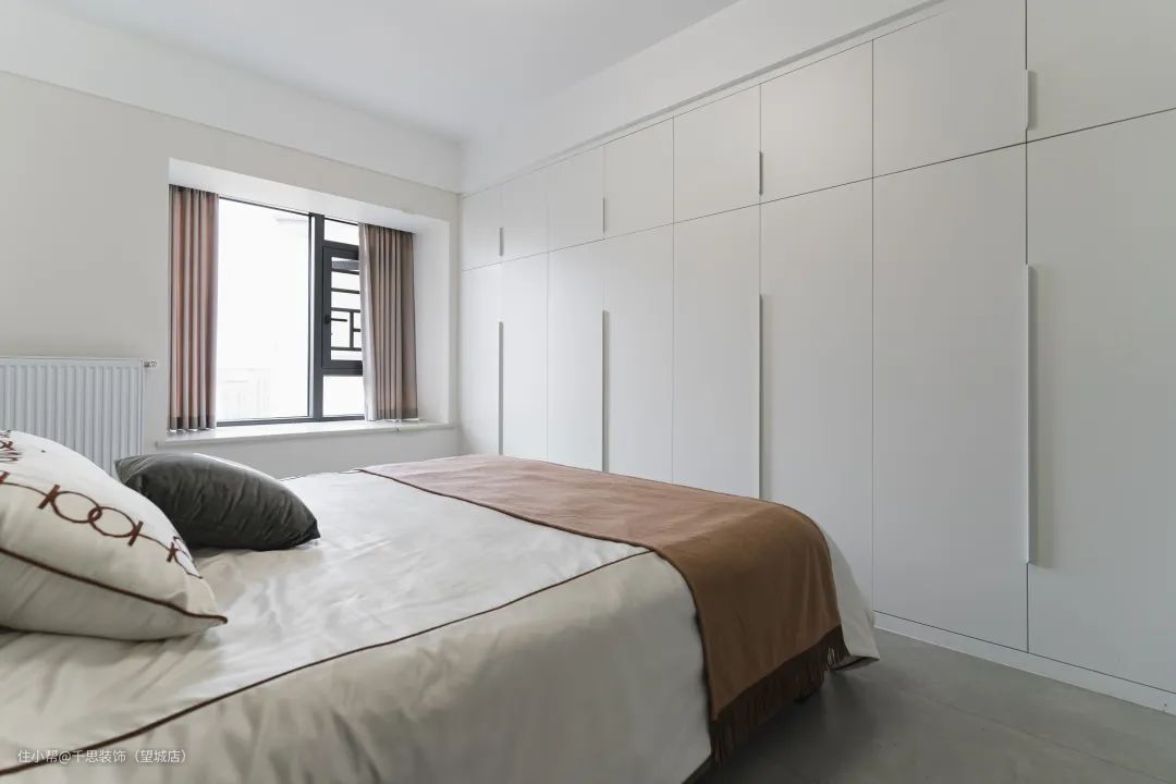 主卧,整体上遵循素雅大气的格调,背景墙以奶茶色填充,在棕色绒布床头的呼应下,两者相辅相成,共同营造出安然静谧的氛围。