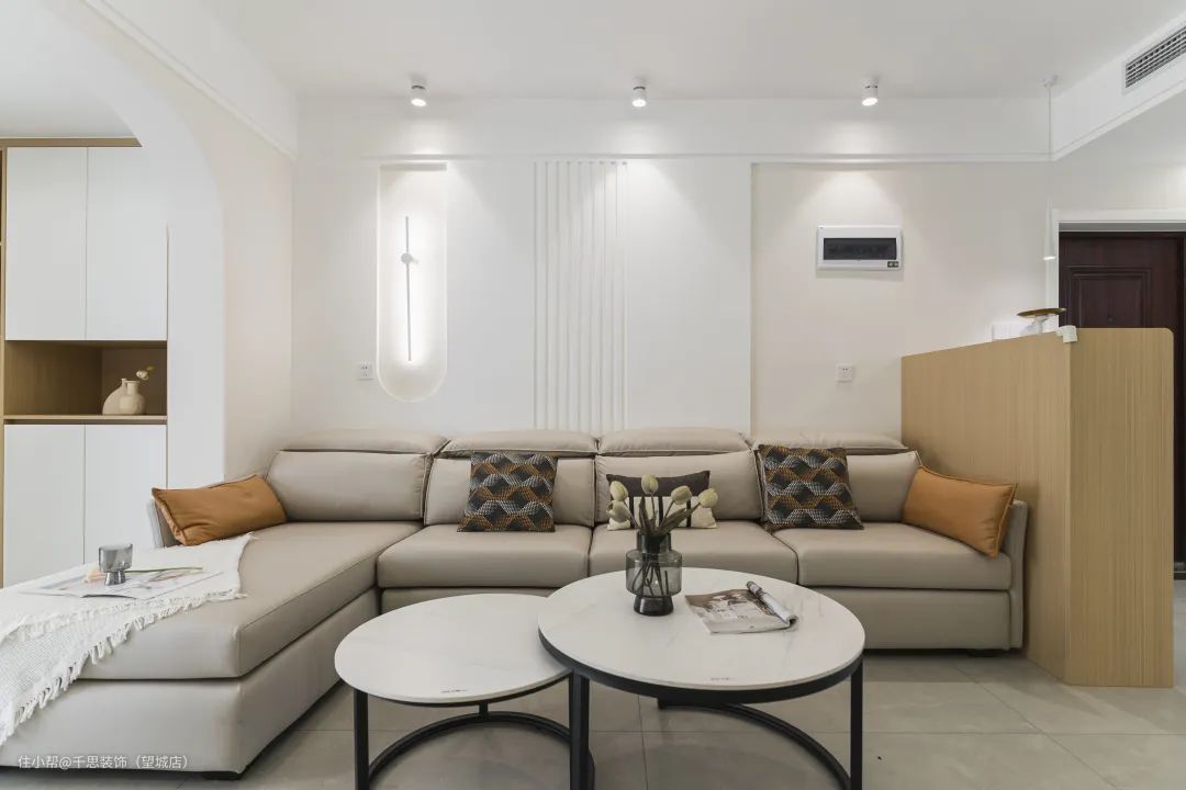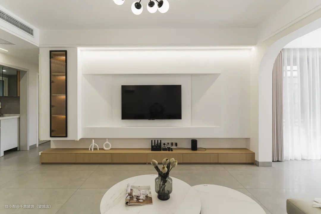 将原阳台暗间拆除后,直接打通纳入客厅,带着暖意的阳光从外倾洒而来,尽显通透自然。浅色哑光地砖铺满至整个公区,温柔徐徐而至。背景墙以奶白色粉刷,搭配纯白木饰面,增添空间质感。于纯白木饰面上设计壁龛,内嵌灯条,在格栅纹理的映衬下,简洁却不显单调。