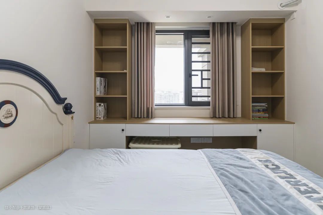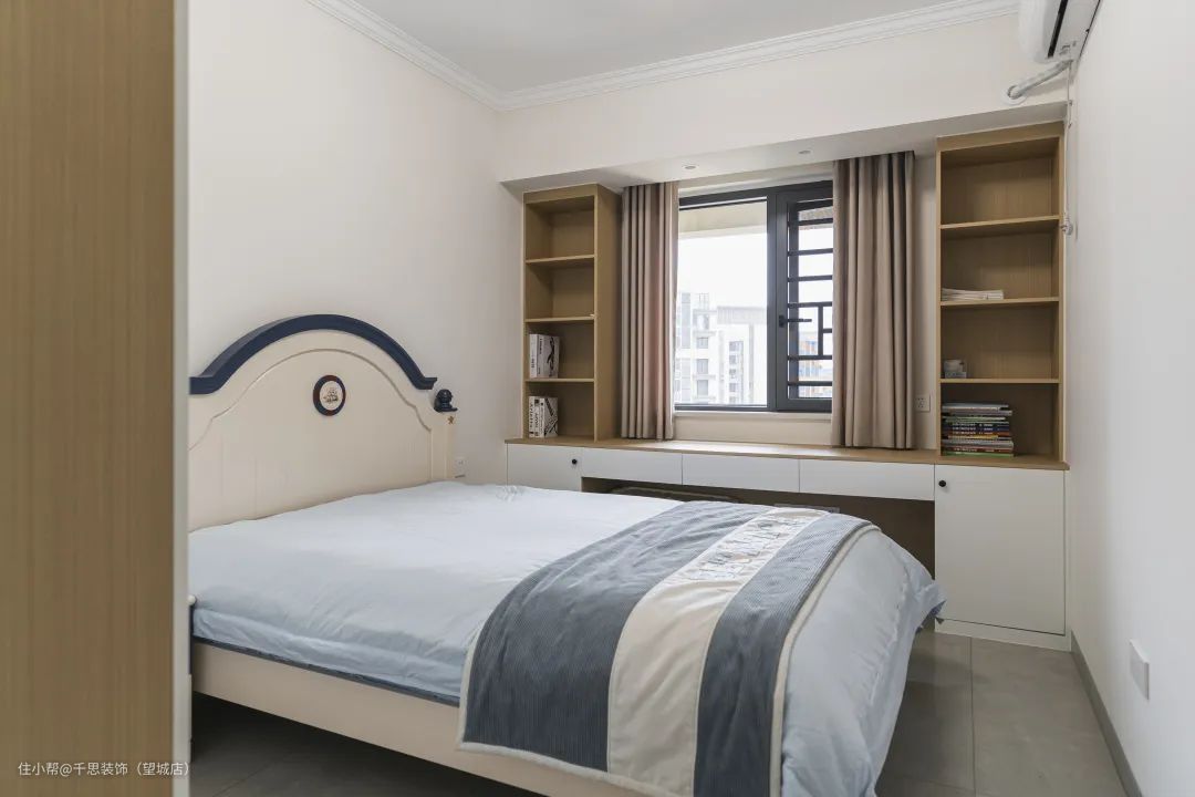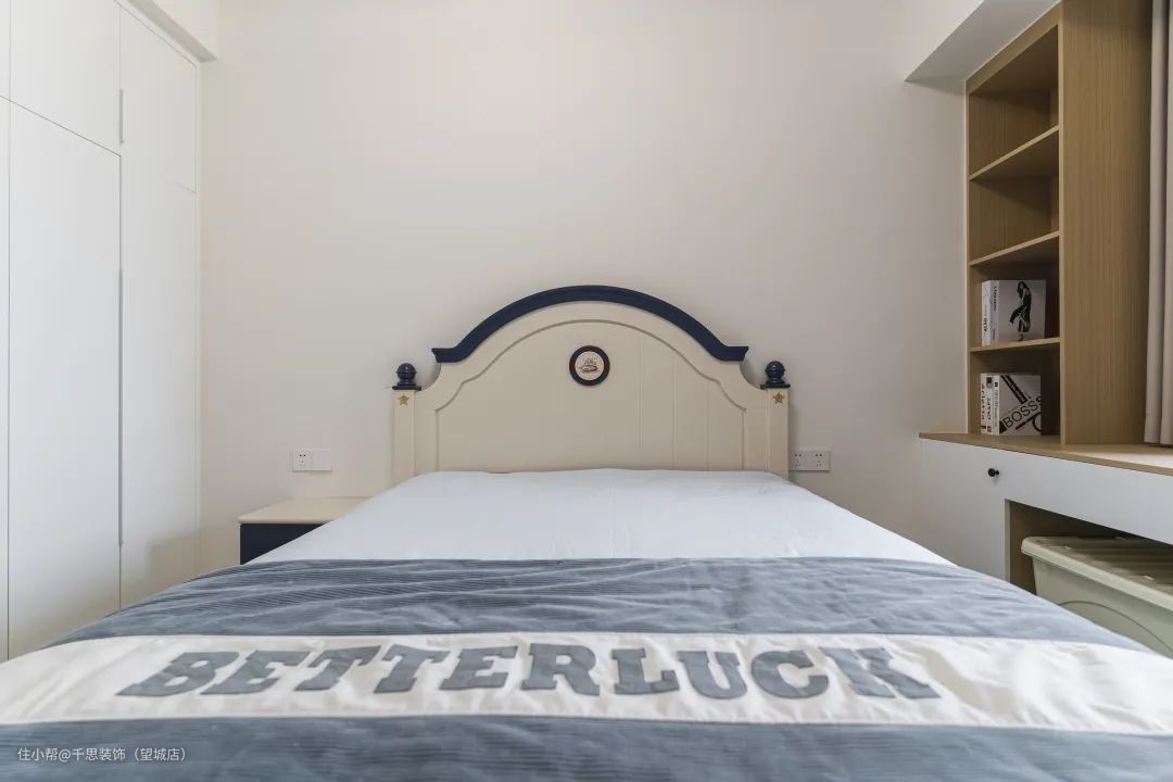 俏皮灵动的蓝色床品,搭配奶茶色床头,是专属孩子的小乐园,自在幸福。床侧定制一排通顶衣柜,白色柜体+极简拉手,足够包容静谧。