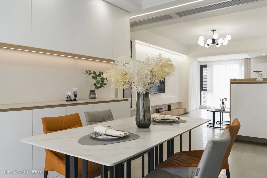 餐厅空间,整体上延续客厅的设计,仍以奶白色+木元素构建,三段式的色彩搭配,不易产生视觉疲劳。挑选极简的岩板餐桌置于中央。 橙灰跳色的餐椅亮丽活泼,辅以干花、绿植装点,营造浪漫优雅的用餐环境。在整体布局上,以最大化的空间陈列上适宜的家居配饰。