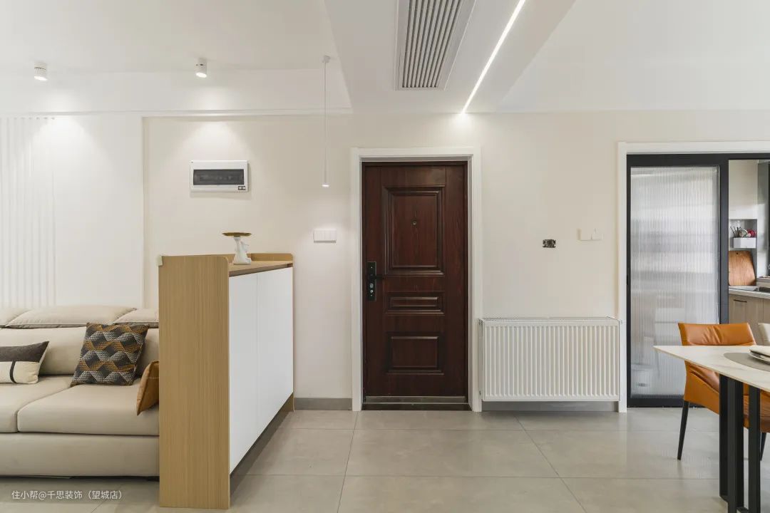 客卫将干区外移,位于过道端口,既提升了颜值又优化了采光。过道大白墙的设计,简洁干净,实用性强,简约风中更注重线条感。