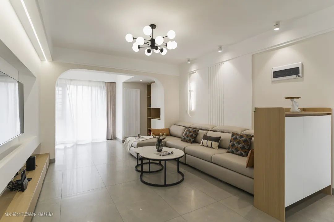 从过道看向整个客厅区,客厅与阳台直接连通,中间采用拱形垭口,视觉上更显生动优雅,于现代风格中融入法式元素,空间更具艺术感。