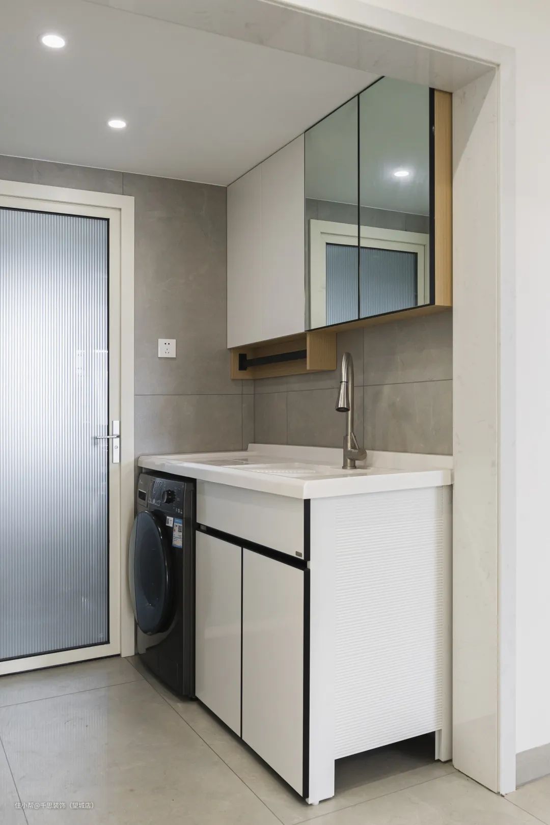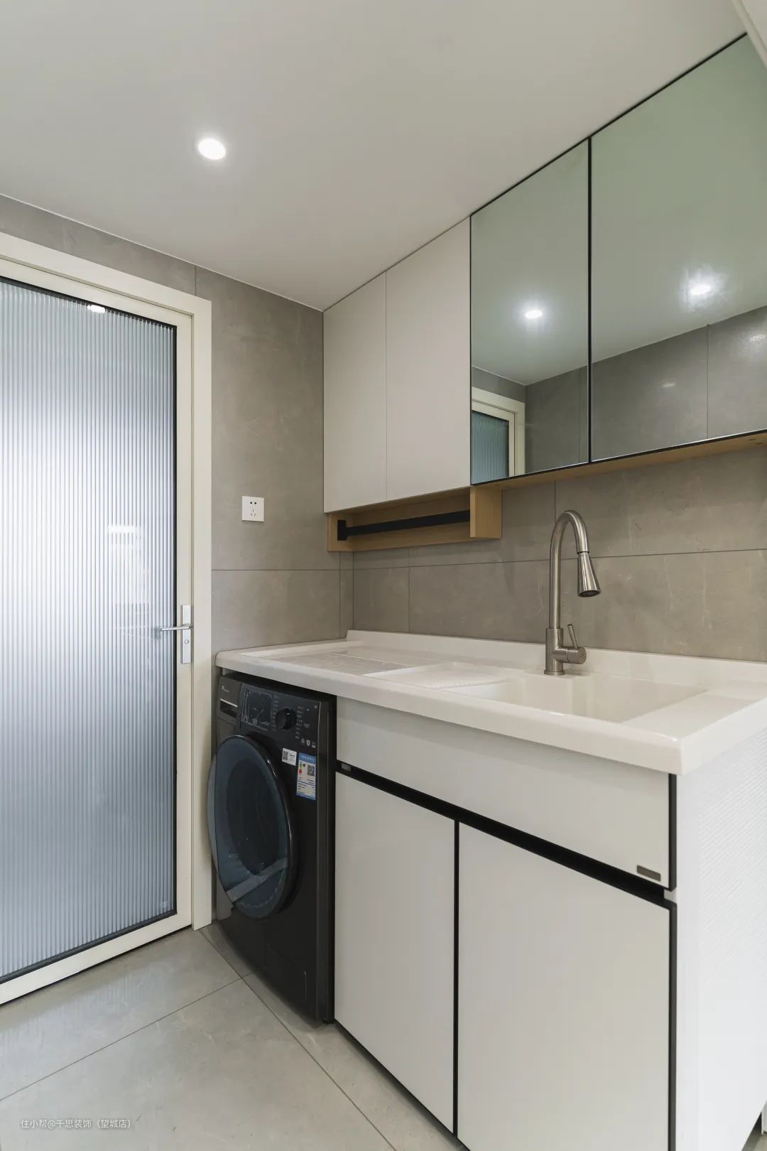 卫浴柜旁安置小型嵌入式洗衣机,空间最大化利用。上方白色吊柜与镜柜并排。顶面极简的无主灯布局,简洁不显累赘,提升幸福感。