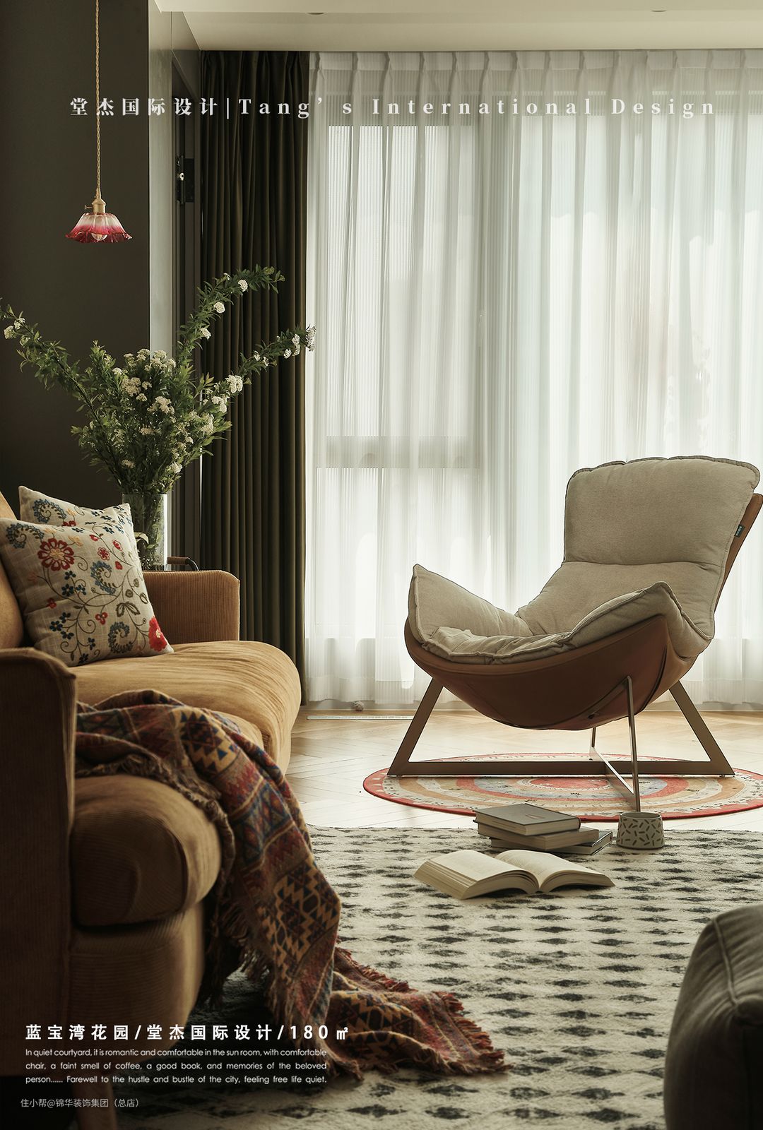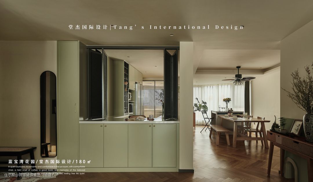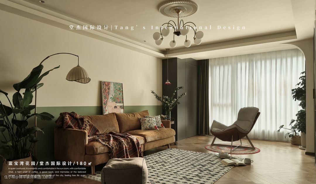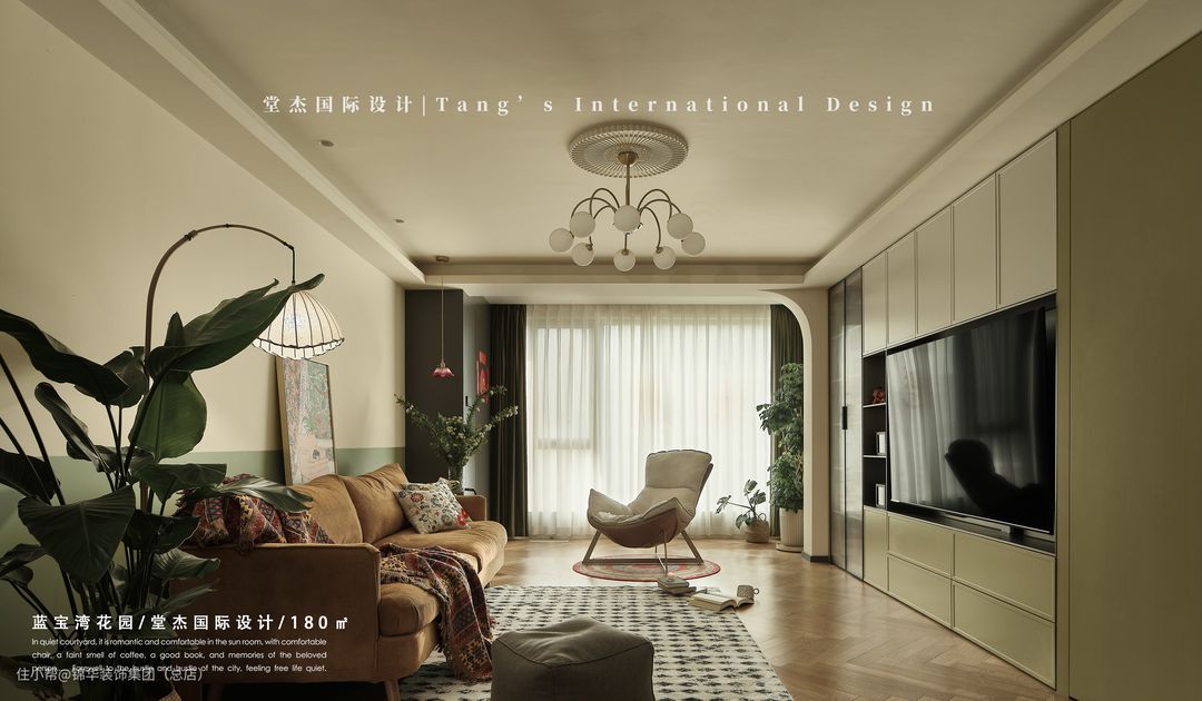客厅随处可见的视觉艺术、家装与设计都能看出风格倾向:法式复古混搭南洋风,特别客厅整面玻璃窗私密又包容,采光非常充足,阳光照射进来,整个空间都会带上浓烈的地域风情,又不失浪漫氛围。 客厅电视背景墙做了一整面的柜体设计,显的朴素又优雅,同时设计师为营造那种由树木景观带来的内心平静与和平的感觉,色调也是介于奶白与绿之间。
