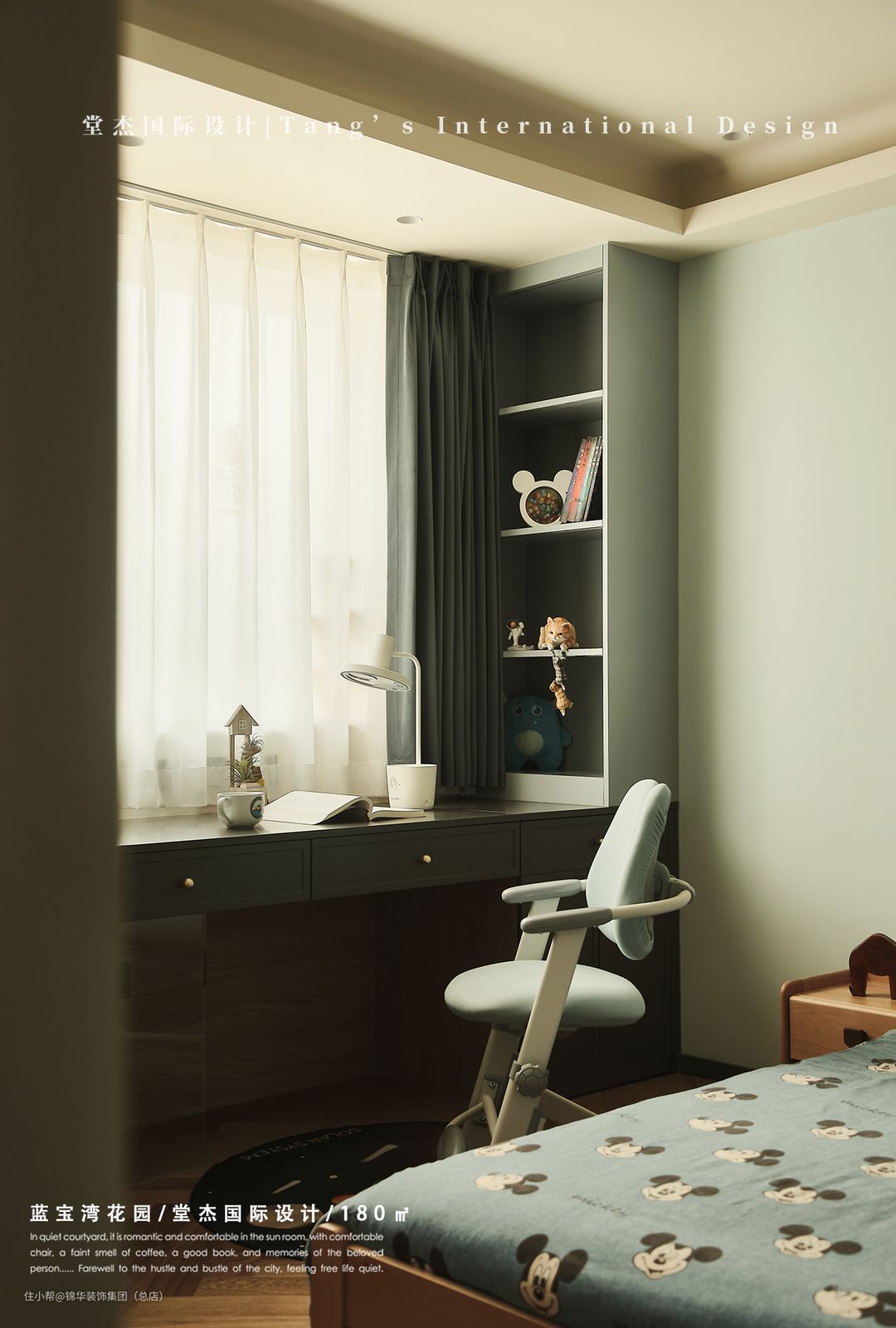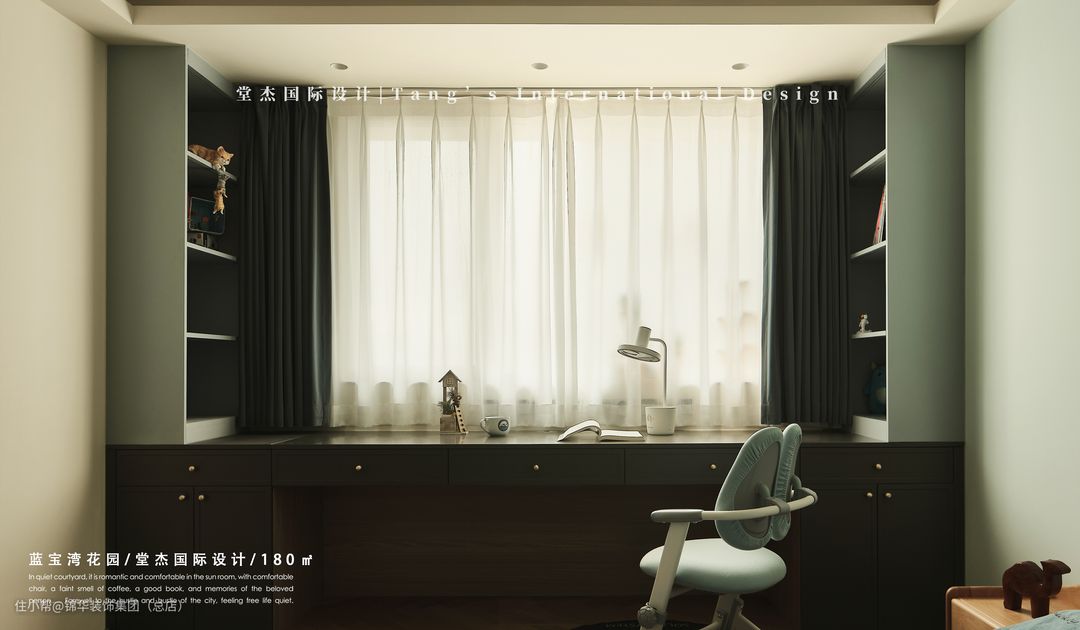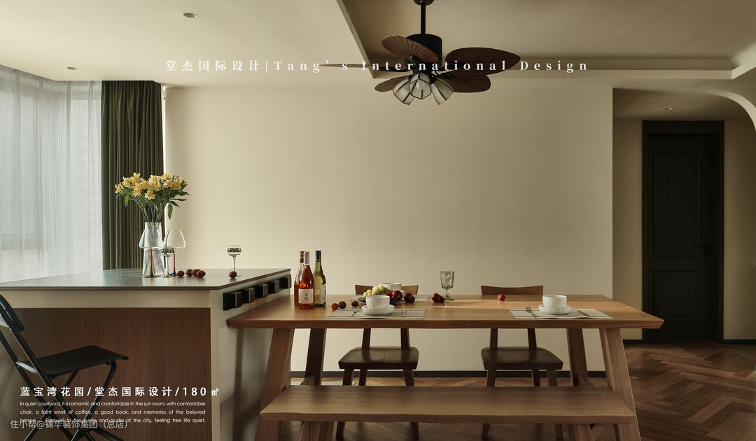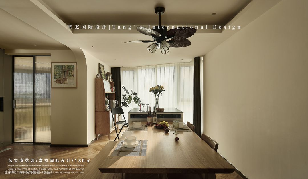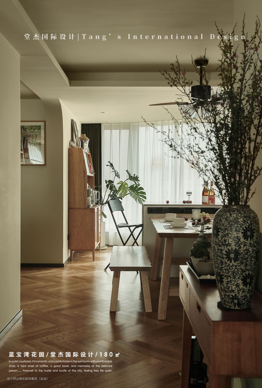 客厅随处可见的视觉艺术、家装与设计都能看出风格倾向:法式复古混搭南洋风,特别客厅整面玻璃窗私密又包容,采光非常充足,阳光照射进来,整个空间都会带上浓烈的地域风情,又不失浪漫氛围。 客厅电视背景墙做了一整面的柜体设计,显的朴素又优雅,同时设计师为营造那种由树木景观带来的内心平静与和平的感觉,色调也是介于奶白与绿之间。