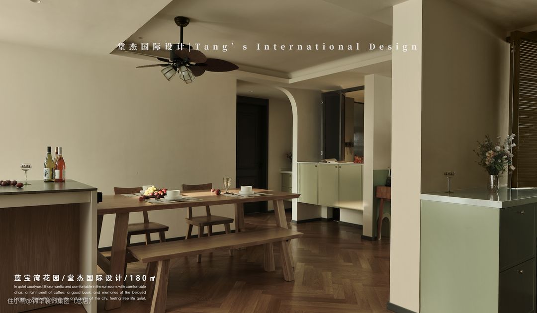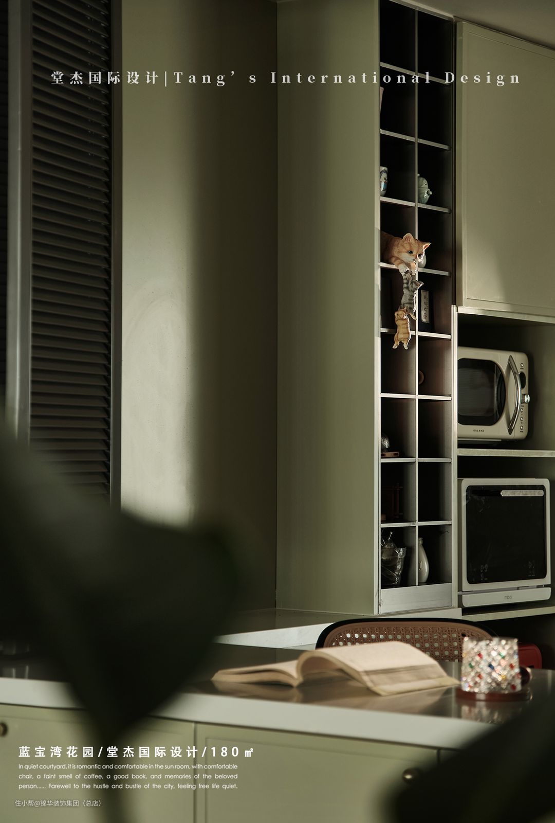 减少空间隔断感,餐厅选择半开放式设计,打开了客厅与厨房空间的联动,扩大家庭空间,能够在恰当时候招待好友,让业主在烹饪食物同时,获得互动的空间和喜悦。 厨房空间适时加入少量黑色元素做搭配。神秘而稳重的黑色和清新平静的复古绿,瞬间也让空间视觉沉淀下来还不乏生机。甚至地板也选择这种棕色鱼骨拼,既保证了地板实用寿命,还显得与众不同。