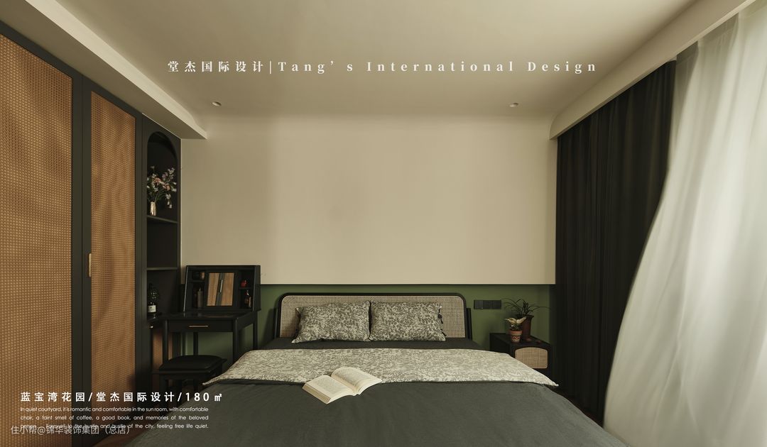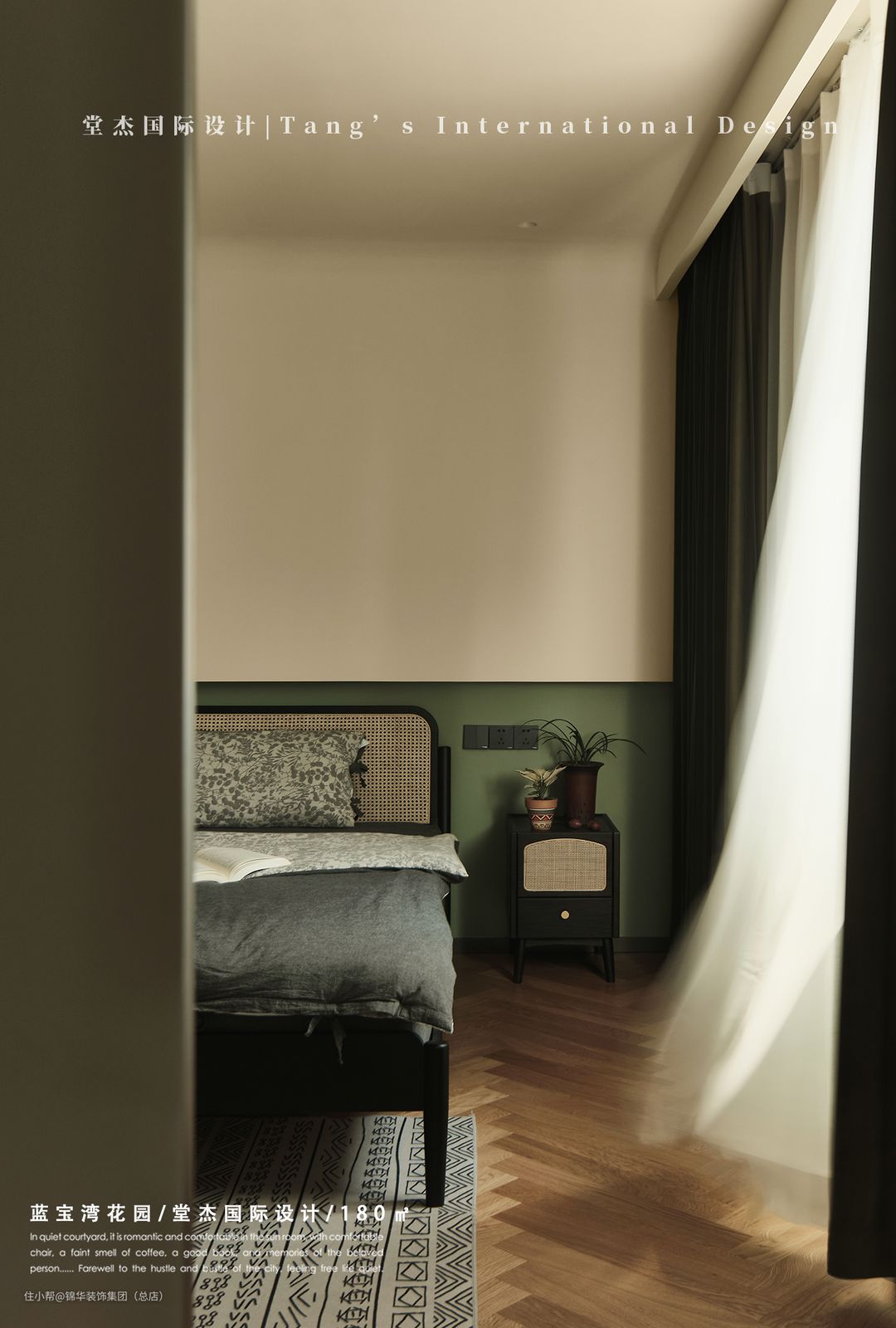 另外卧室空间墙面两种颜色从黄金比例腰线分割,营造出质朴怀旧感,柔软又体现了可持续发展的未来环保走向,而且热带绿植加上藤编,好像给人带回大自然内,造就了空间极具地域风情的人文美学气质。