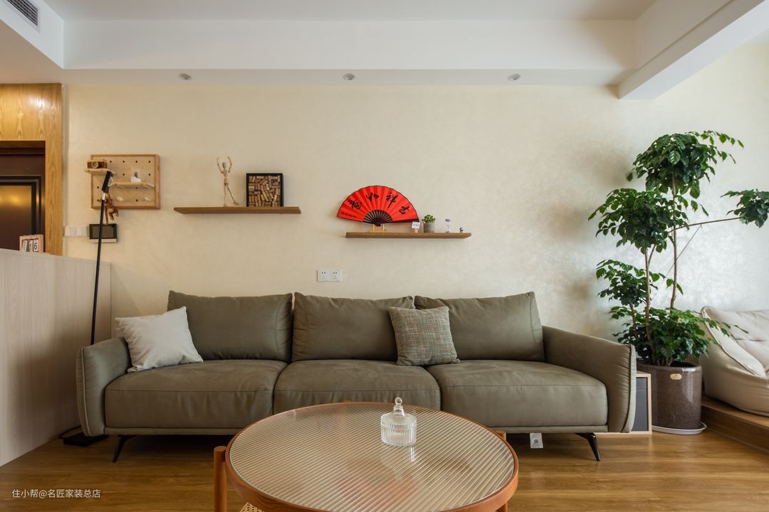 客厅背景墙偏米黄色,营造静谧之居。3人位布艺沙发以慵懒的姿势出现。背景墙的层板可放置小物件,起到装点空间的作用。大棵幸福树让家中充满着鲜活的生命力。
