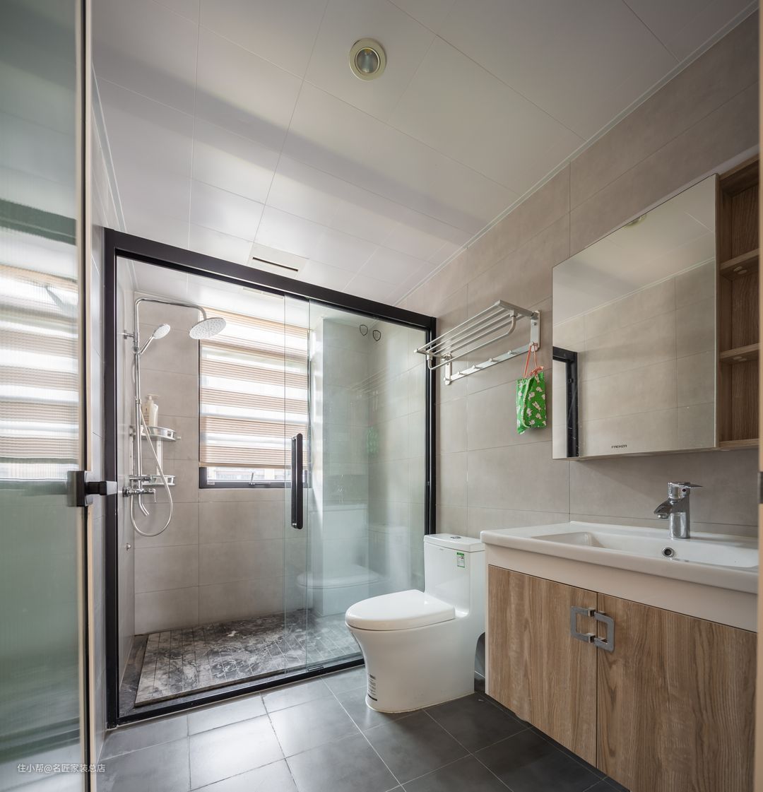 卫浴间采用了木质浴室柜,深灰的地面,米色的墙面,融合成一个洁静纯粹的卫浴空间。