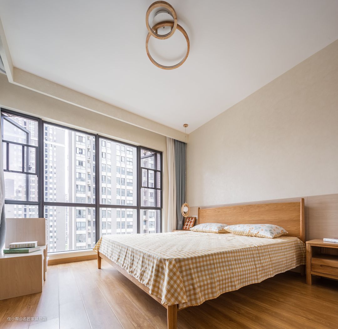 主卧室的空间进行了优化,将原采光极好落地窗的阳台位置打通纳入室内,让主卧的光线更加通透。靠房间内侧设计整墙衣柜,方便生活所需。木色的地板和同色家具,整个主卧设计简洁,透出恬淡安然的情怀。