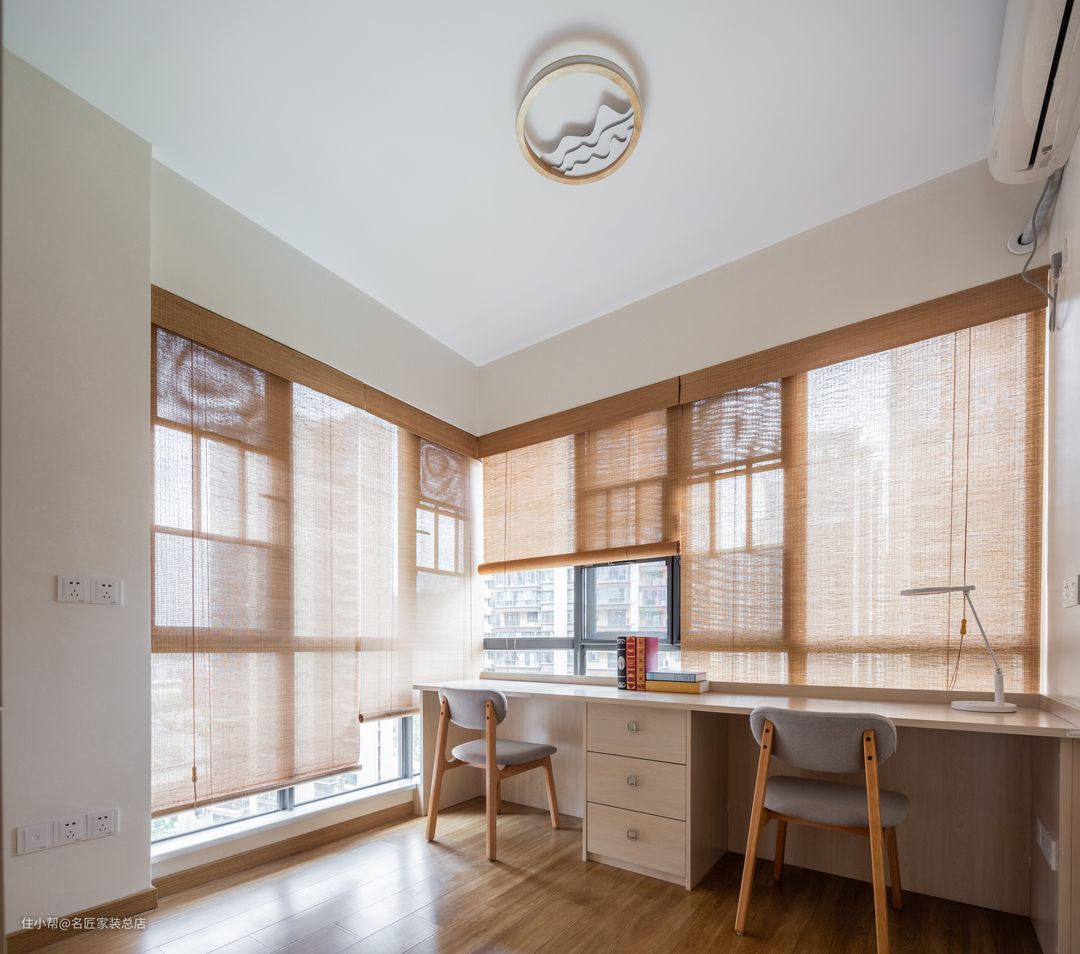 设计师运用了拥有转角落地窗的居室设计成书房,拐角的落地大窗,让房间拥有无尽的阳光、清风和窗外的美景。书桌是双人可共用的设计,非常有爱,自然的木色,一卷竹帘,让室内更添宁静的气质。