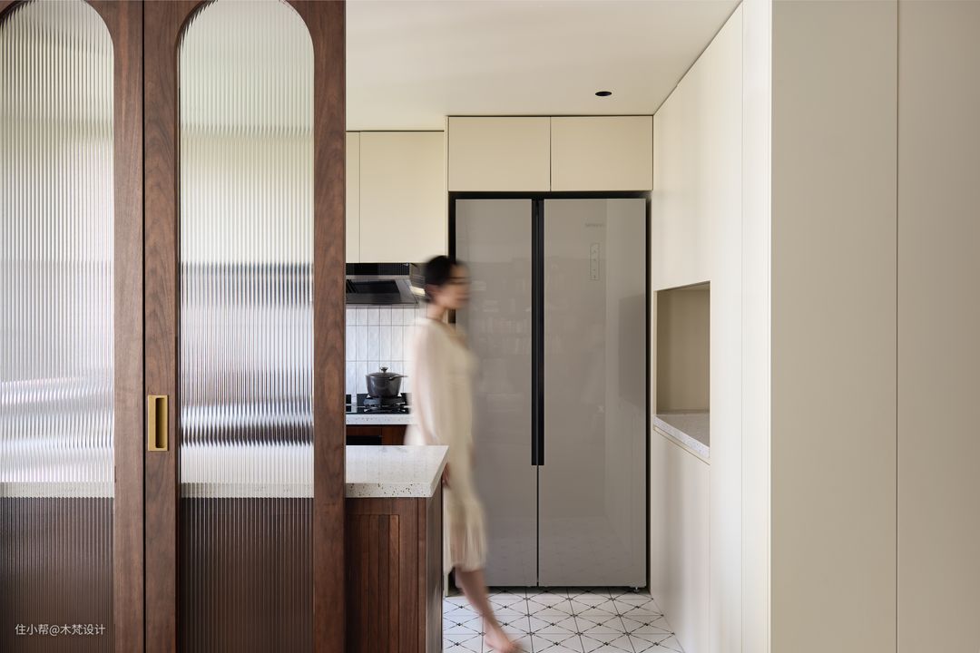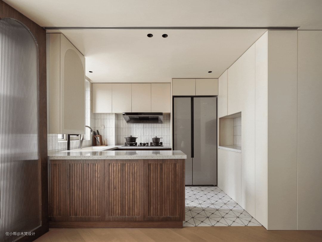 厨房空间增加岛台,操作台面积和储物空间都得到了提升,顶面安装内嵌无边框射灯,合理布置的光源,即便是在厨房角落依然明亮。西班牙进口珍珠砖在光影照射下微微泛出珠光,浪漫往往就在不经意之间。 厨房用折叠移门做隔断,半开放式设计,移门敞开不影响空间的交互与整体感,还能增进家人间的互动。长虹玻璃搭配胡桃木拱形门框和金色把手,透光不透人的光影意境,移门拉上也能自成一景。地面采用小花砖拼接木地板,充满烟火气息的厨房似乎也可以变得清新干净。