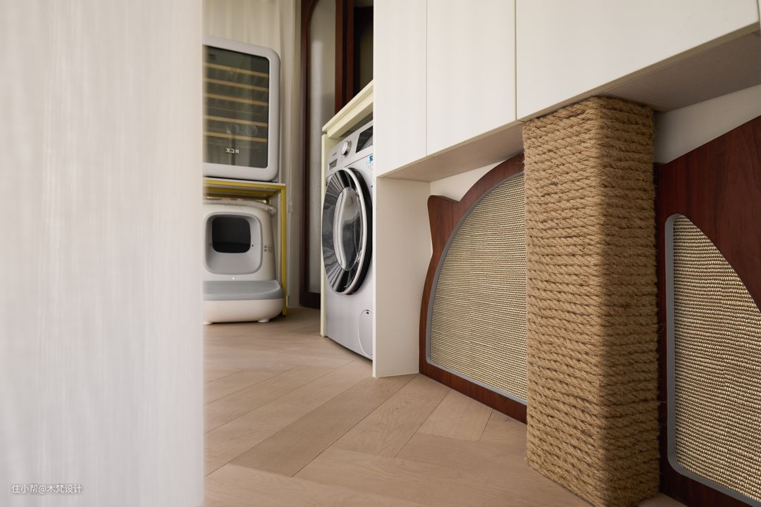 阳台长走廊则是小猫的天地,用剑麻绳将管道包裹,自带猫抓板属性,在柱子后预留电位,小猫的电动喂食机可以放在这里。