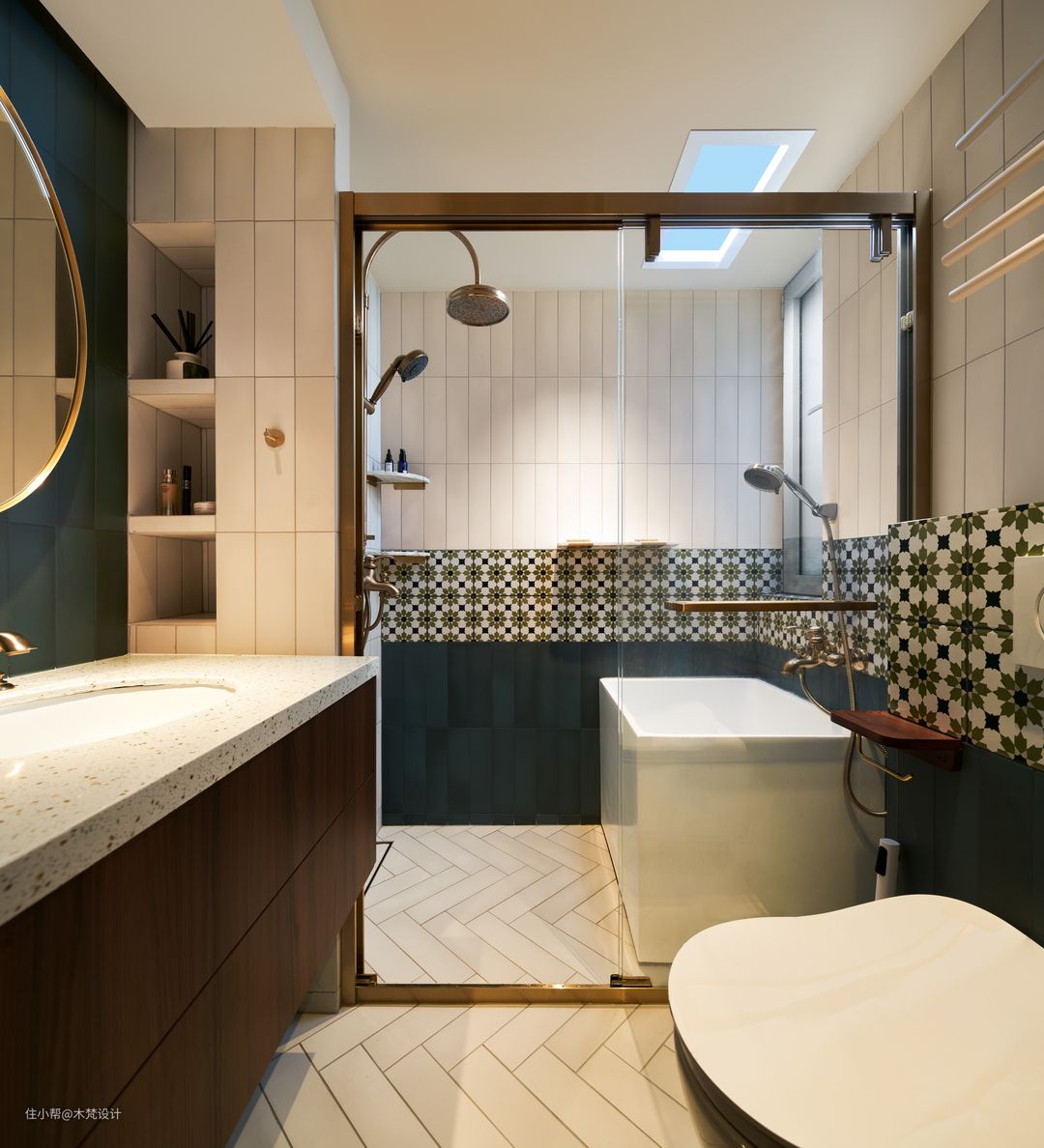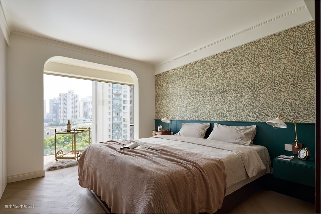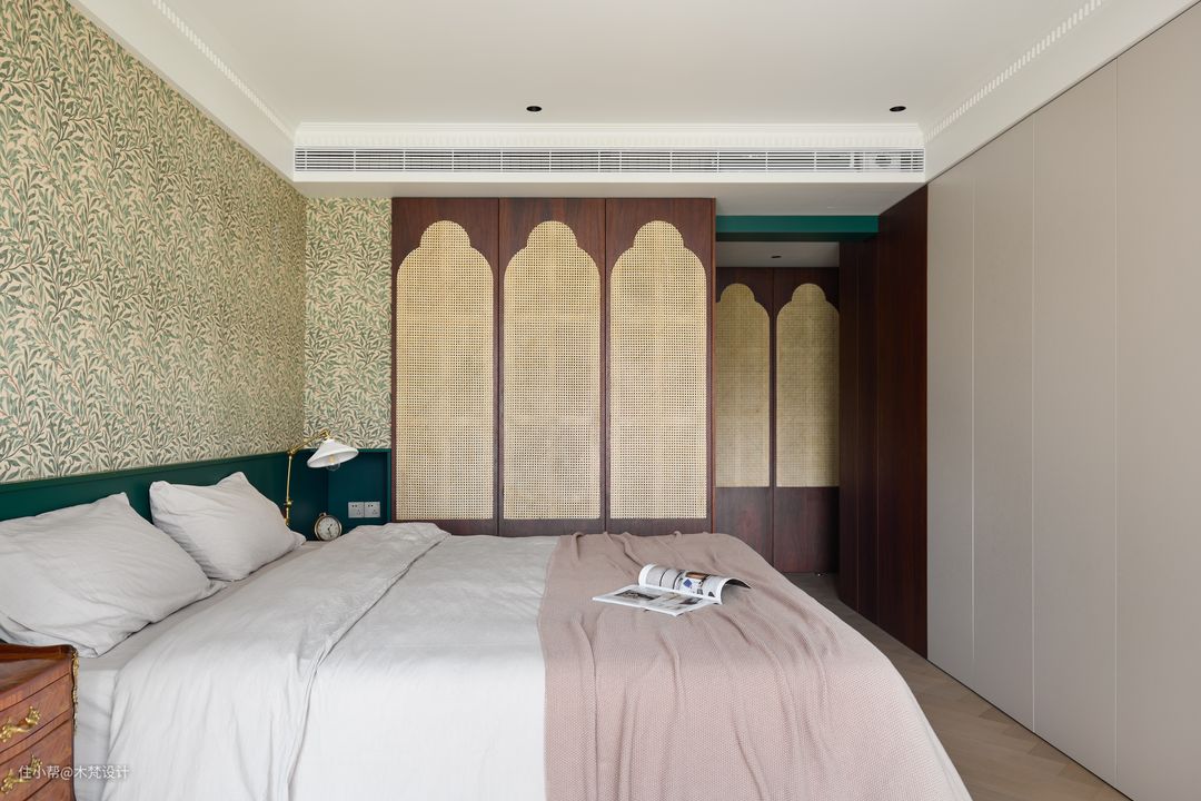 主卧沿用公区浓郁的法式风格,拱形元素和石膏线条依旧浪漫。但我们调整了色彩的比例,白色和绿色作为空间主导,胡桃木色做点缀,空间少了一些厚重,多了更多清爽。 绿色的床头背景与两盏对称的床头灯,打造柔和舒适的睡眠环境。 在衣柜融入藤编元素,打破到顶柜体的肃穆,空间也多了更多的休闲与自然。 主卫则是延续公区法式的风格,增加了金属元素的占比,空间更显优雅与精致。不同样式的瓷砖在墙面组合,色彩简单却也能让空间散发浓郁法式氛围。顶面一盏天空灯,室内泡澡也能体验阳光扑面的惬意。