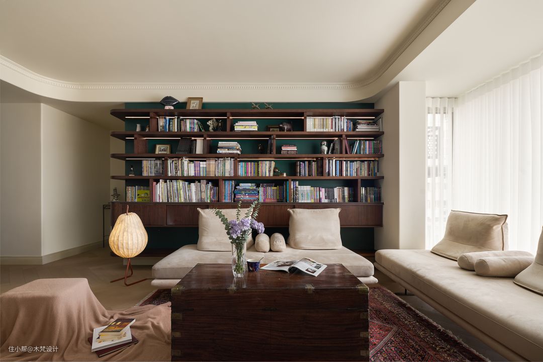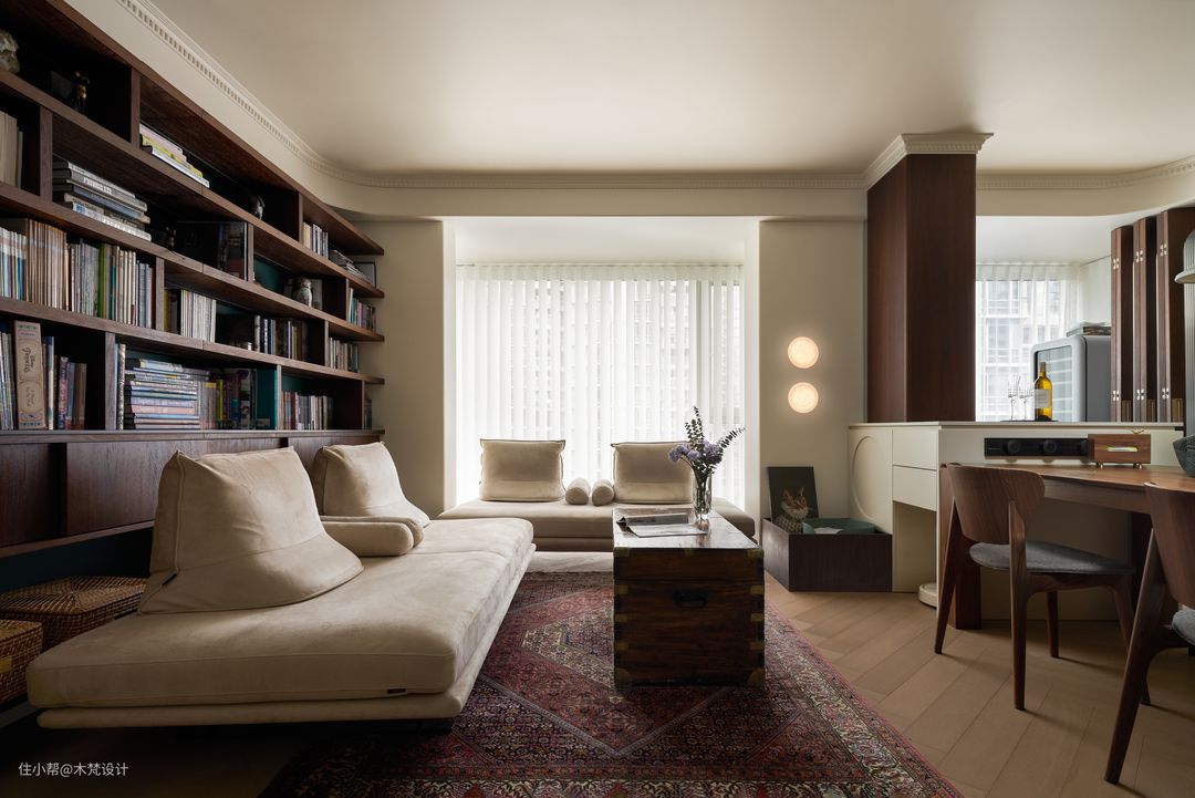 在软装的选择上,采用了与高饱和色系空间氛围不同的米白色,色彩深浅间的平衡,柔软的沙发更能让人放下内心的戒备与不安,窝在沙发上享受舒适自在的休闲时光。 业主旅游时淘来的地毯和柚木色箱子,意外贴合书架墙的复古气质,用箱子作为客厅的茶几,空间显得有韵味又别致。