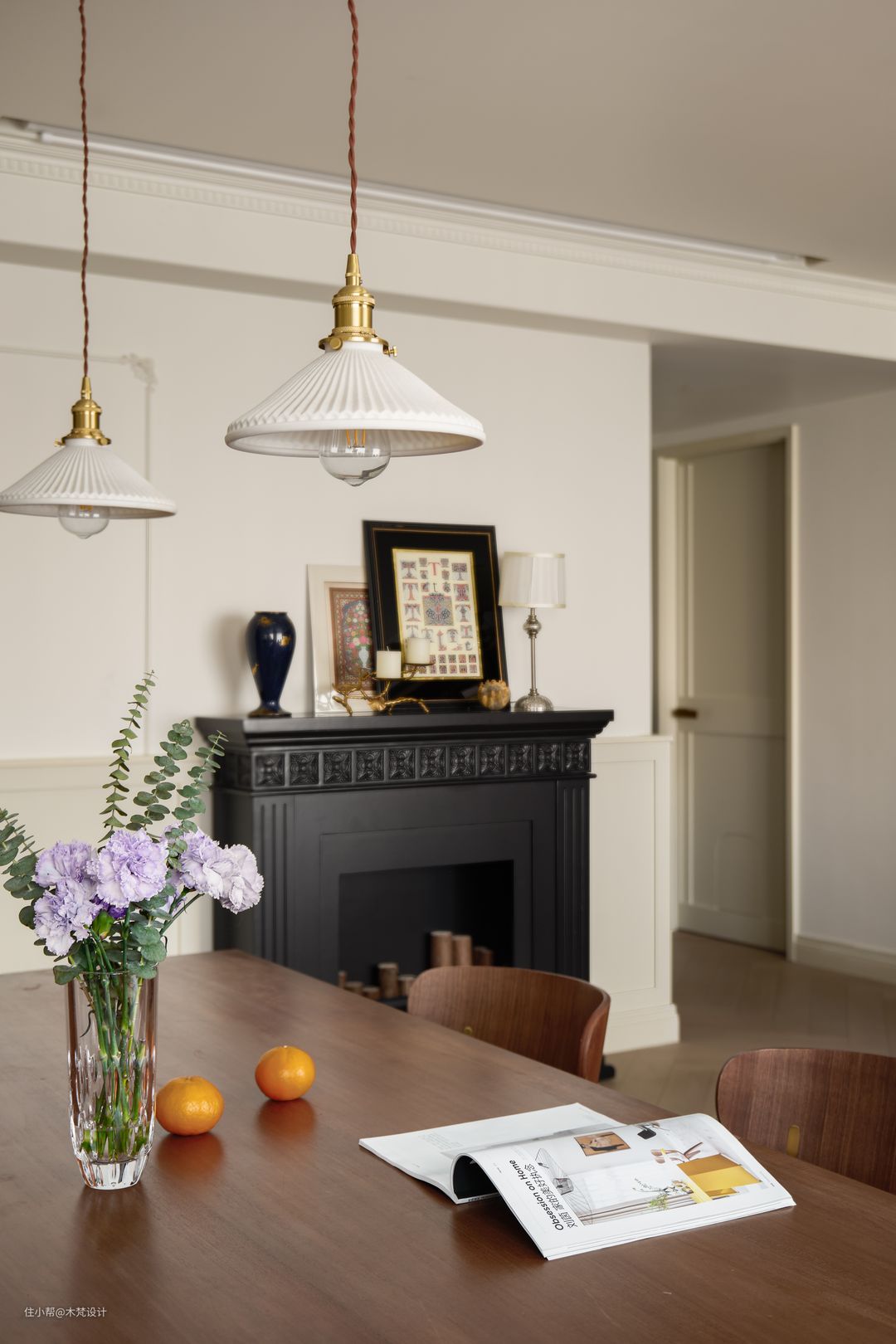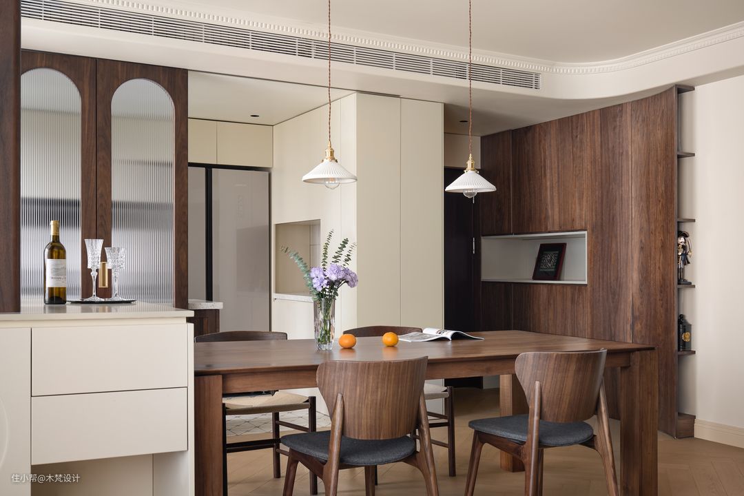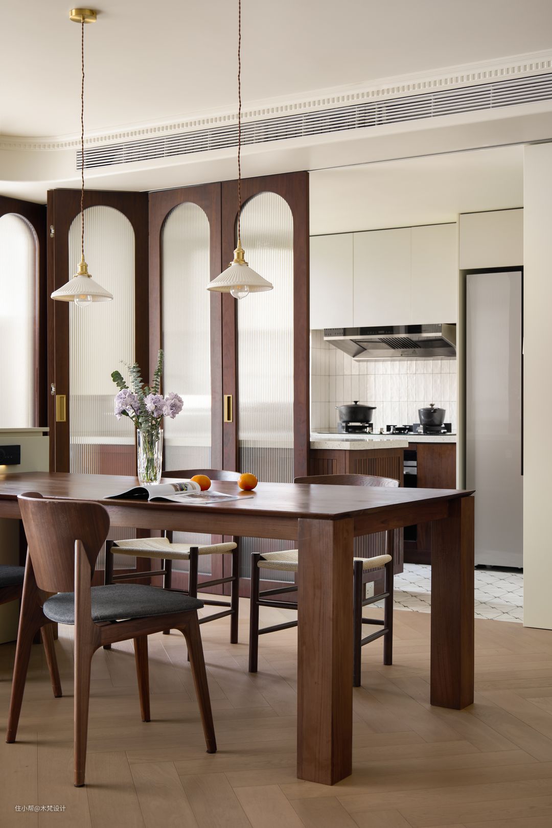 与客厅相邻的餐厅同样运用了大量胡桃木的材质,长方桌配上两盏伞状吊灯,轻盈的复古气息扑面而来。餐桌选用可移动款,平时紧挨岛台,将餐桌和岛台分离还可满足更多人使用。