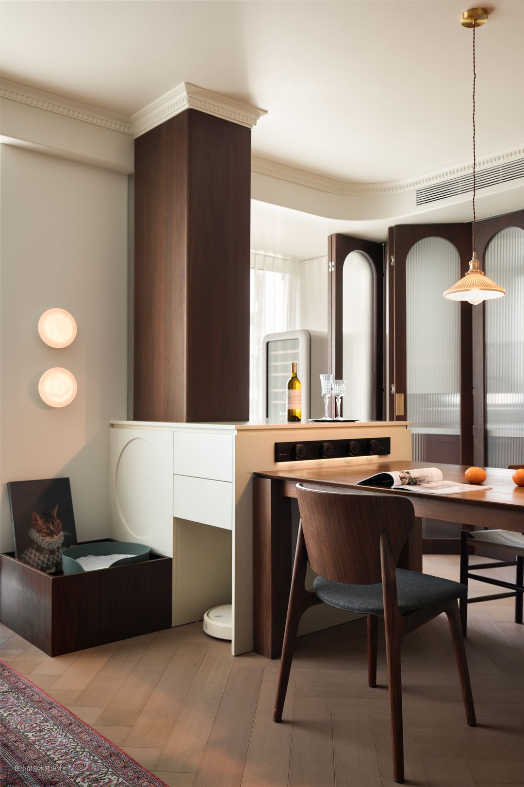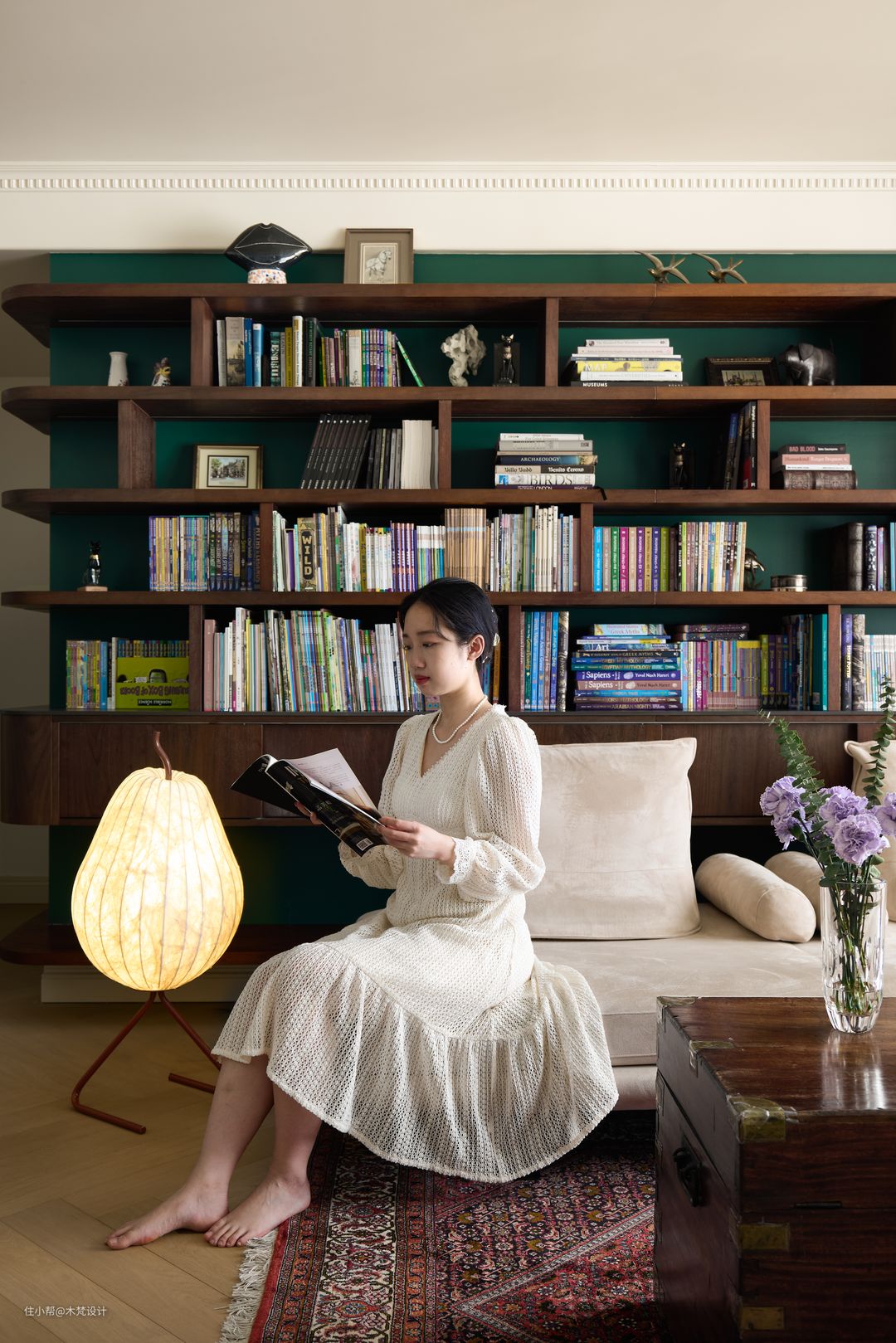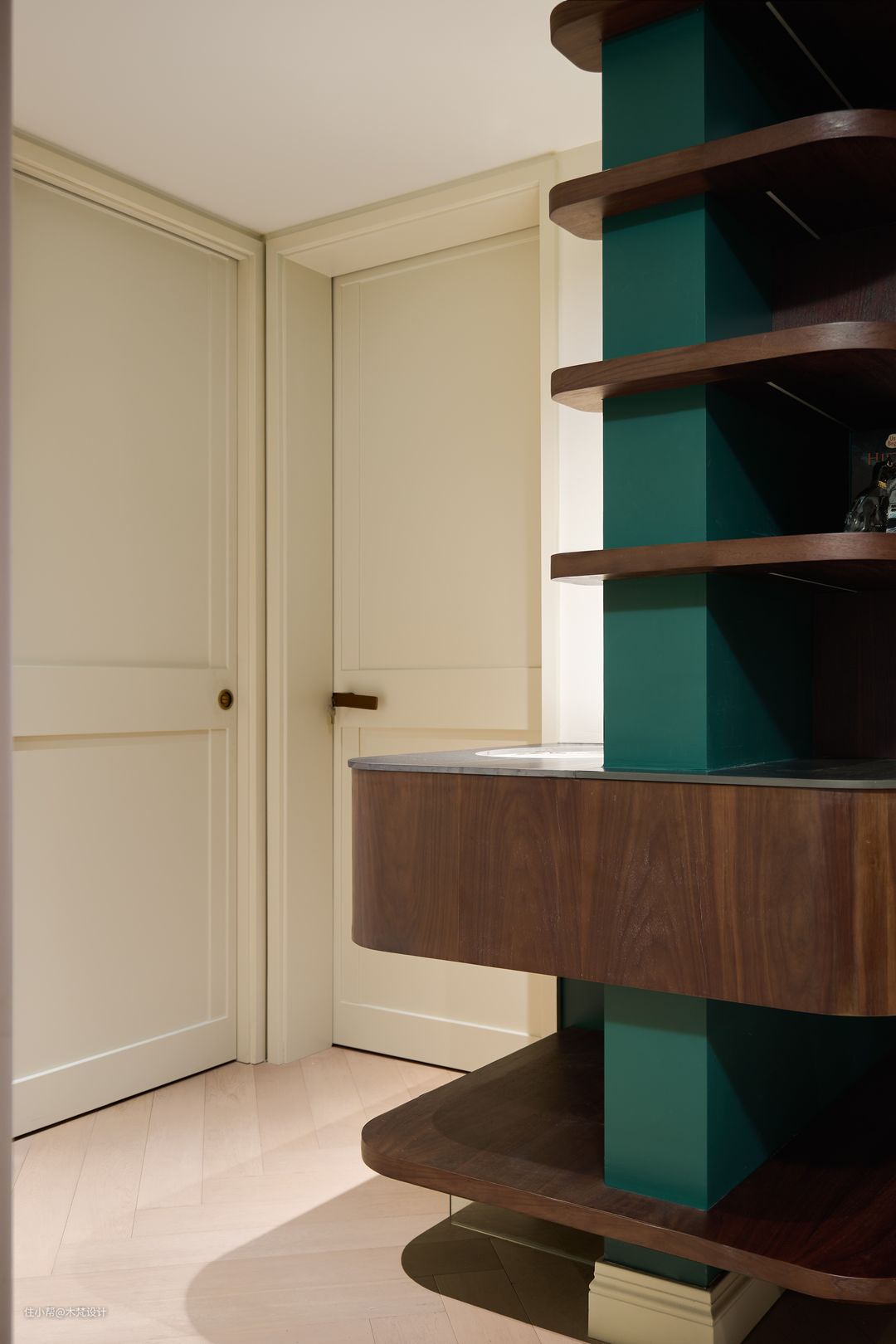 步入客厅,空间变得开阔,视线马上被眼前复古造型的开放式书架墙所吸引,错落的展示格已经被屋主填满,生活的痕迹随处可见。墨绿色与胡桃木结合,让人仿佛置身在浓郁的法式庄园中。 书架绕过墙面做干区置物架,弧型转角的处理与玄关相呼应。墙与顶则是繁与简的碰撞,简单的石膏线是顶面唯一的装饰。 墙面做半高护墙板,适当的留白,视觉集中在定制款黑色壁炉上,法式氛围更纯粹。设计师也正好利用这面空墙,顶面预留轨道安装电动升降幕布,可以观影、互动、阅读的客厅就此达成。