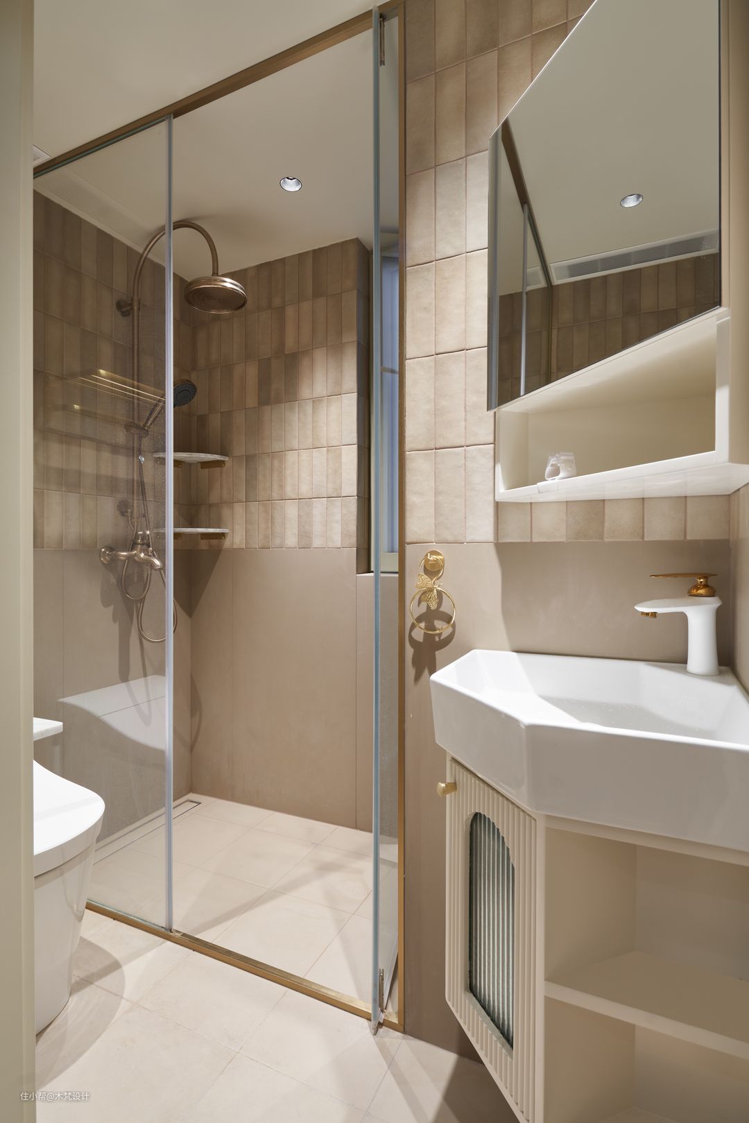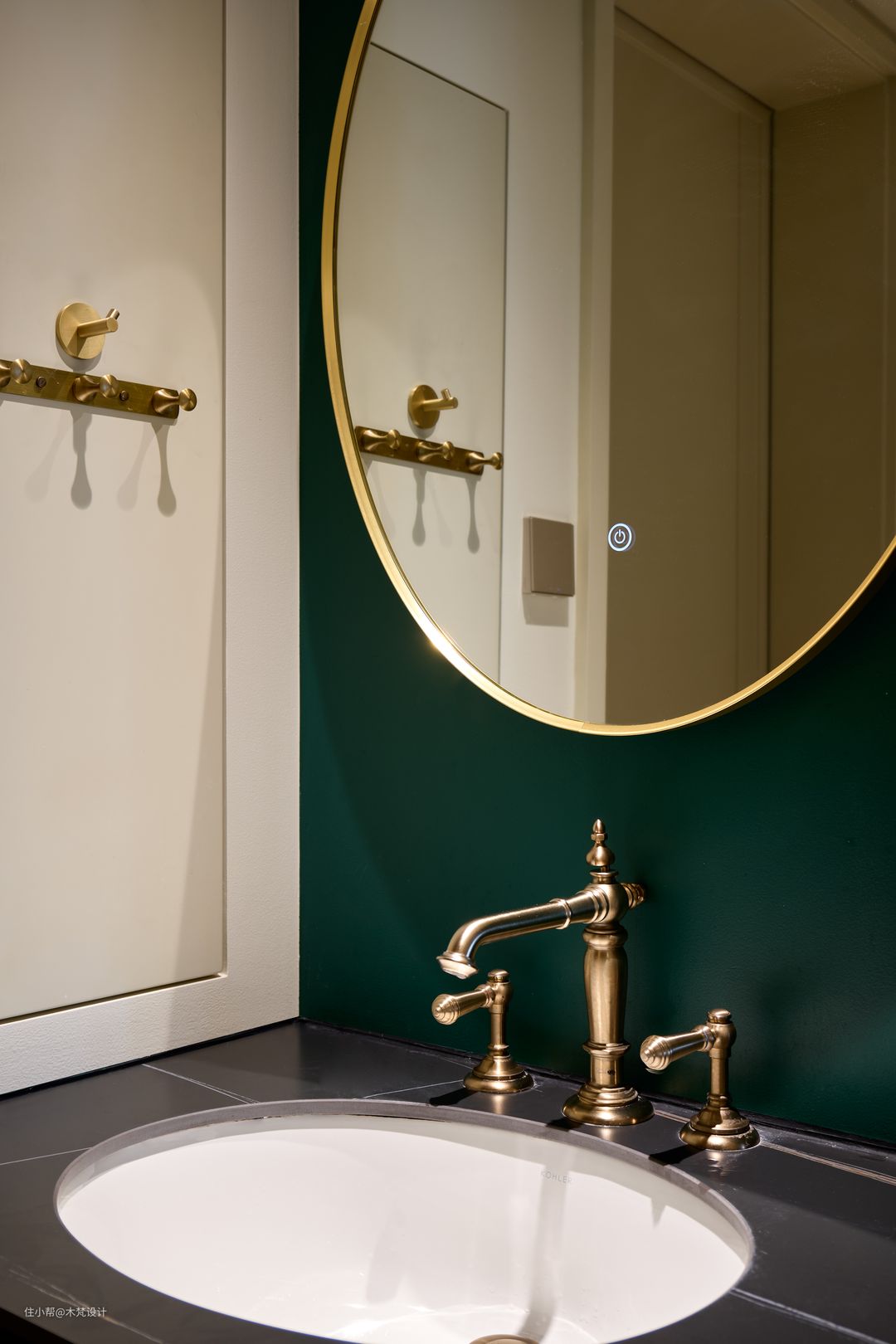 考虑到客卫使用者主要是小女儿和保姆,为避免使用拥挤的情况,我们在过道增加洗手台盆。金色拉环置物架挂,小巧如宫廷中的精致与优雅。