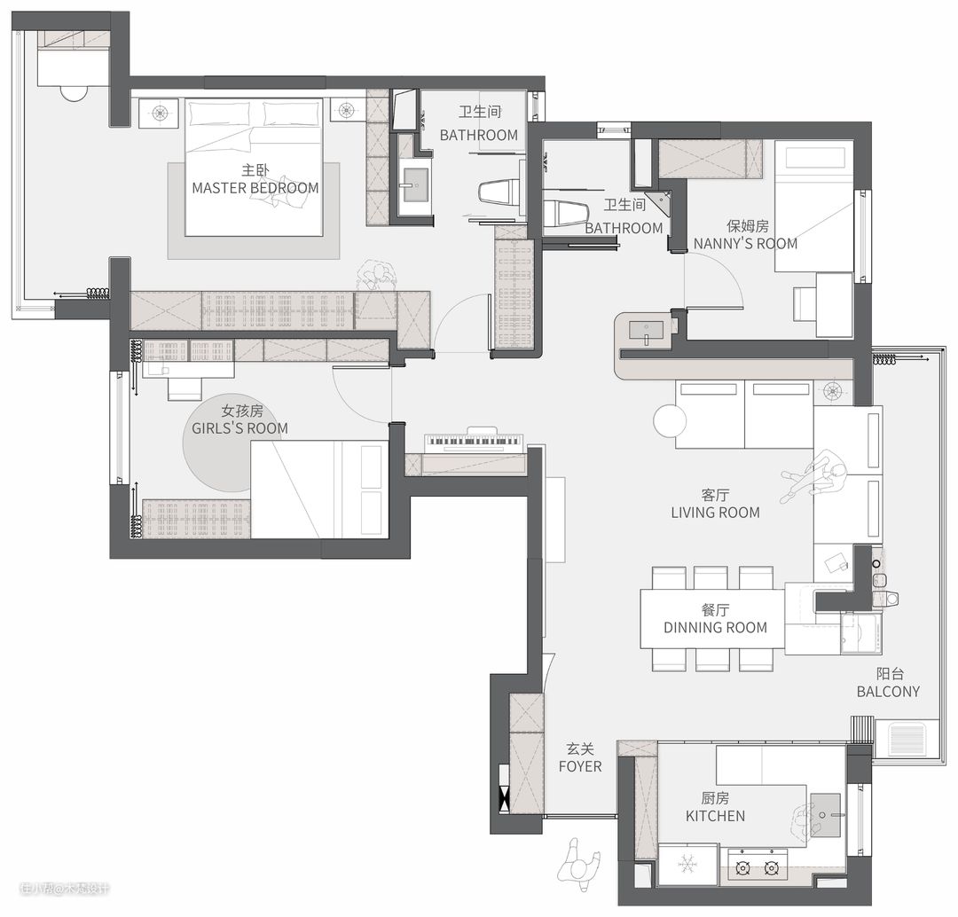 原始户型隔墙多,主卧与次卧相通无法保证私密性。入户处被隔出一条长走廊,既压缩了客厅的面积,整个动线也非常不合理。当我们把非承重的墙体拆除后,空间被打开,无论是采光还是通风都得到了很大的改善。 ➢屋主需求: ● 需要可以满足夫妻二人、小女儿和保姆各自独立的生活空间 ● 家里养了一只小猫咪,需要猫咪的活动空间。 ● 需要给小女儿预留练琴区。 ● 充足的收纳和展示空间。 ● 习惯了海外住宅的复古风格。