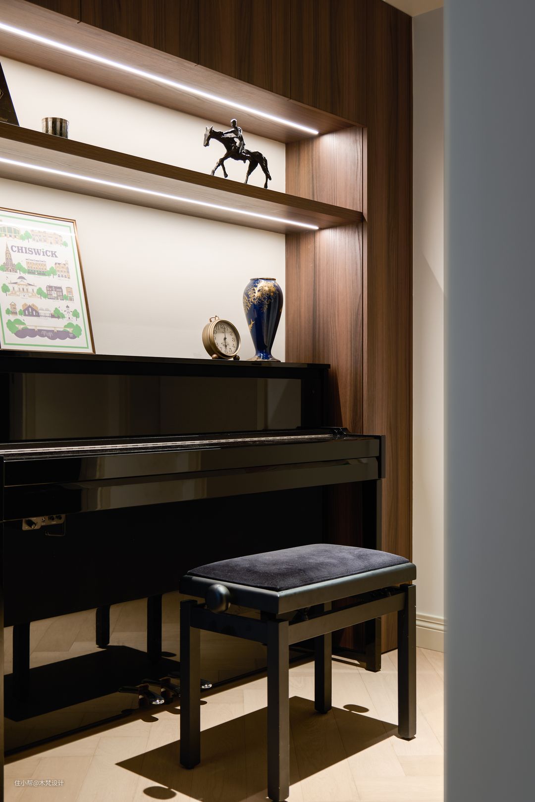 利用空间过道作为小女儿的练琴区,走出卧室就能弹奏出优美乐章。胡桃木展示架下内嵌感应灯带,不用担心练琴时光线不足而造成近视。金框时钟放在钢琴上,微微做旧的痕迹,空间弥漫出古老的历史气息。