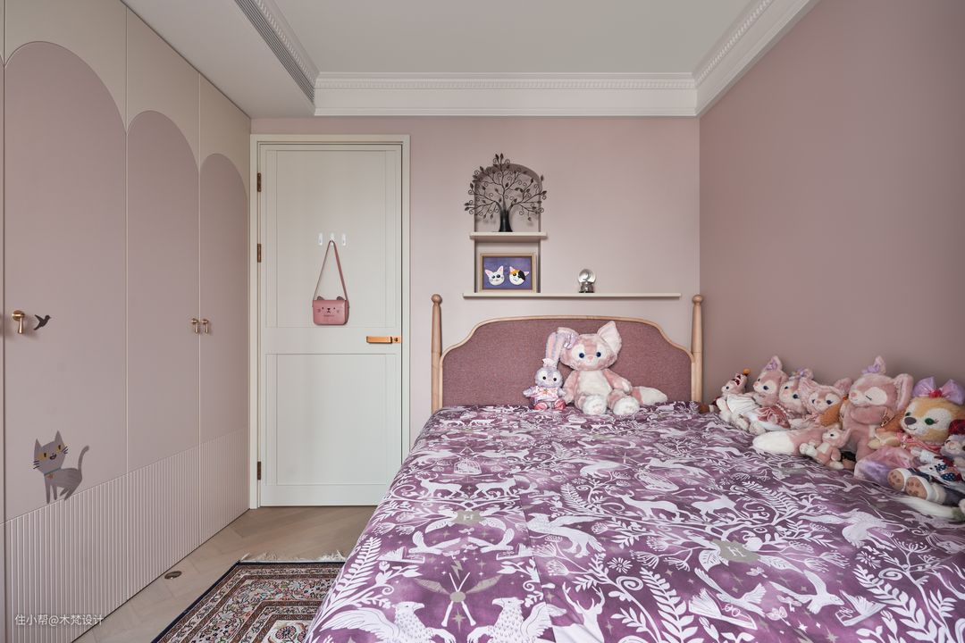 进入到女儿房,则是进入了粉色的天堂,床头的置物架上童真的摆件、衣柜上精致的把手和可爱的贴纸,无一不在保护小公主幸福的童年。