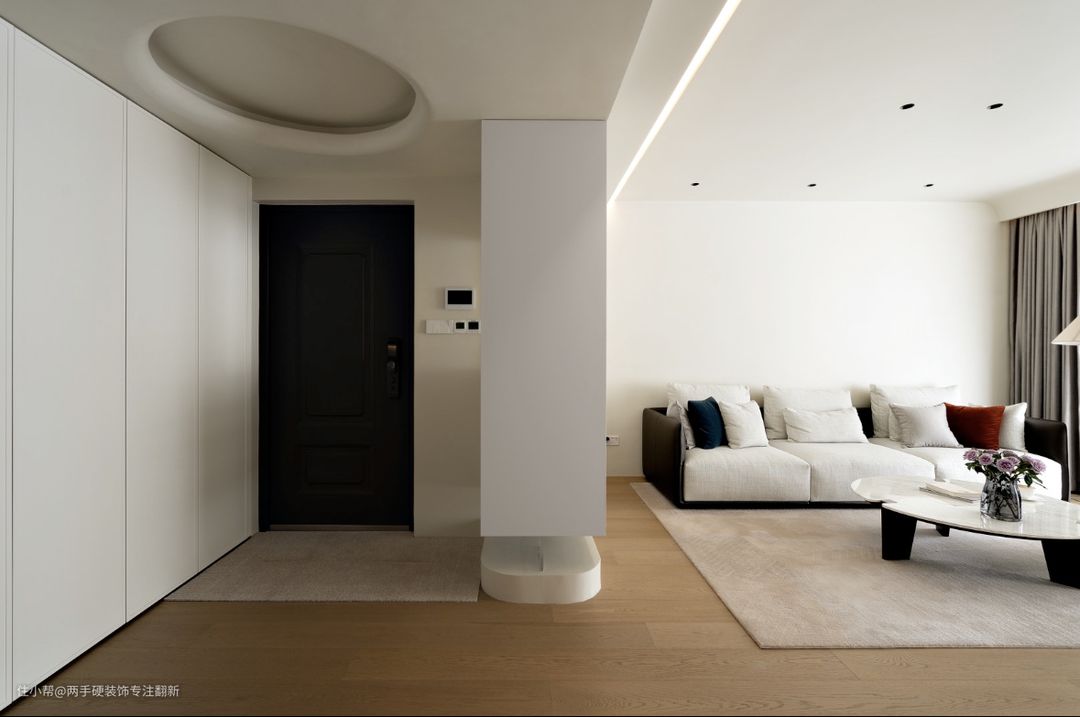 进门左手边,是单独做出来的一个悬挂柜,中间透空一块,可以看向客厅。客厅电视墙是一个完整的浮墙。转到后侧的开放式书房,做这种全内嵌式挂墙电视机,要做伸缩支架,且电视墙的厚度要做到180MM左右,电视才能完全塞进去。