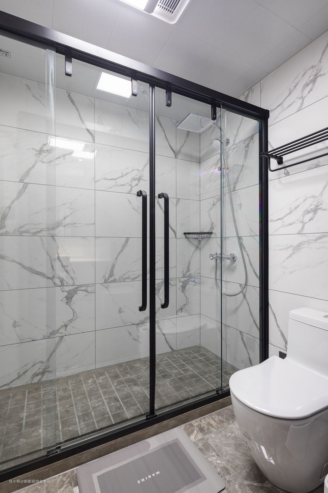 卫浴空间以气质黑白调为主,搭配花纹大理石,不动声色流露出现代都市高级质感,淋浴房的黑色金属边框利落有型,缔造出兼具颜值与实用的舒压区域。