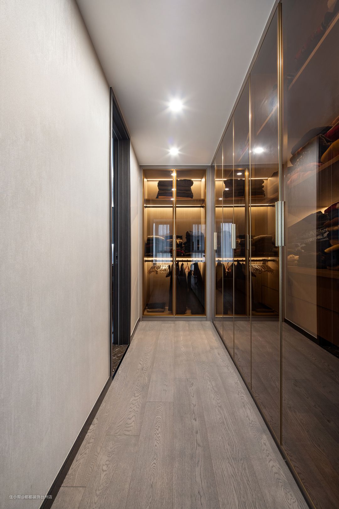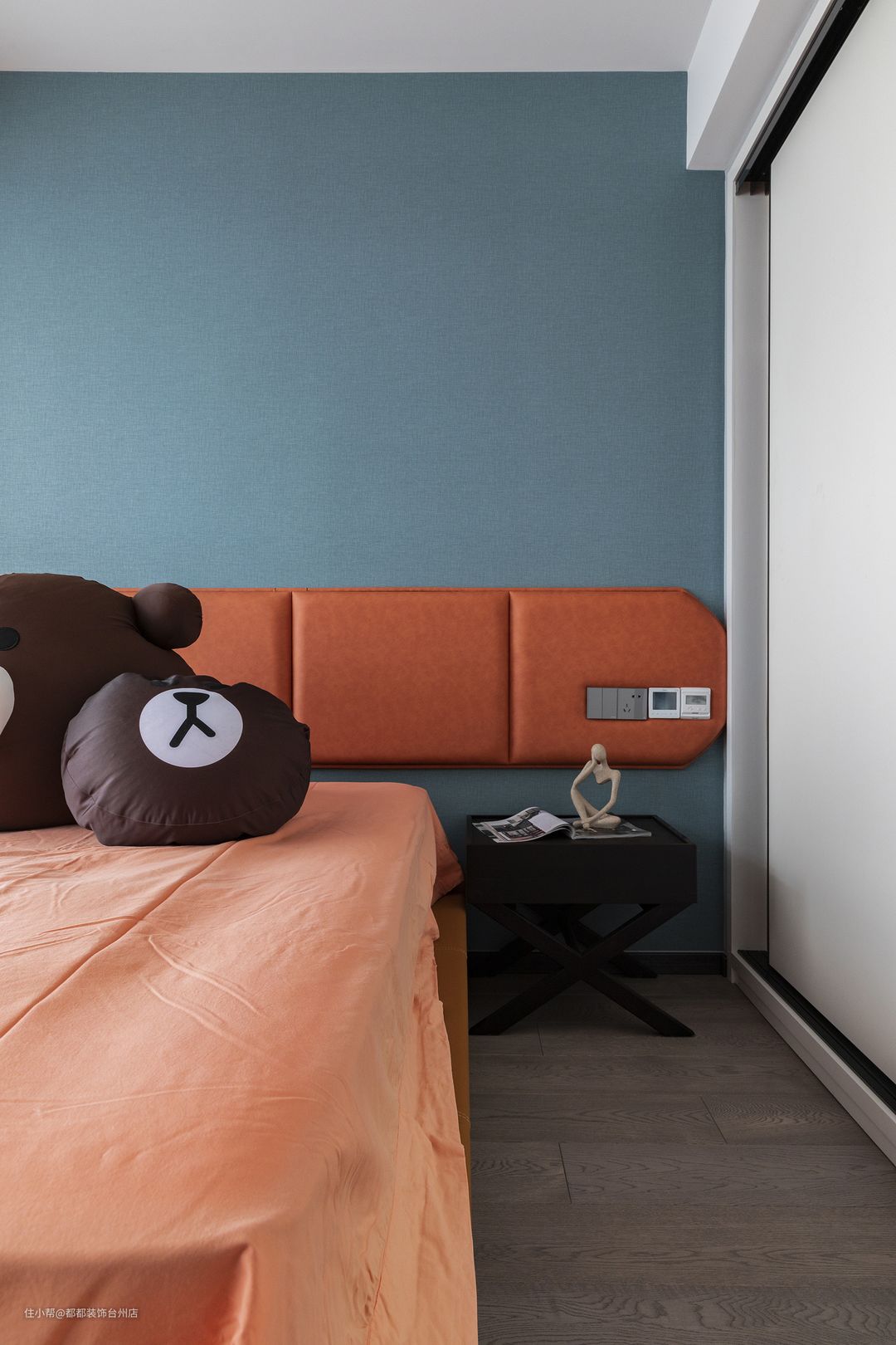 主卧沿袭了全屋的精致与时尚,深蓝色的硬包背景墙搭配亮橘色软包床,两者赋有视觉冲击力的配色调和出摩登优雅的空间基调。 主卧衣帽间设置在主卧内部,没有自然采光的情况难免会给人沉闷的感觉。因此在设计上,这个衣帽间使用了大面积的玻璃门板。玻璃材质通透,还具有镜子的效果,可以反射衣帽间内景象,在视觉上让人感到衣帽间面积翻了几倍。同时业主可通过透明的玻璃门板,更快速的找到自己要拿的衣服,提高了业主的使用效率。