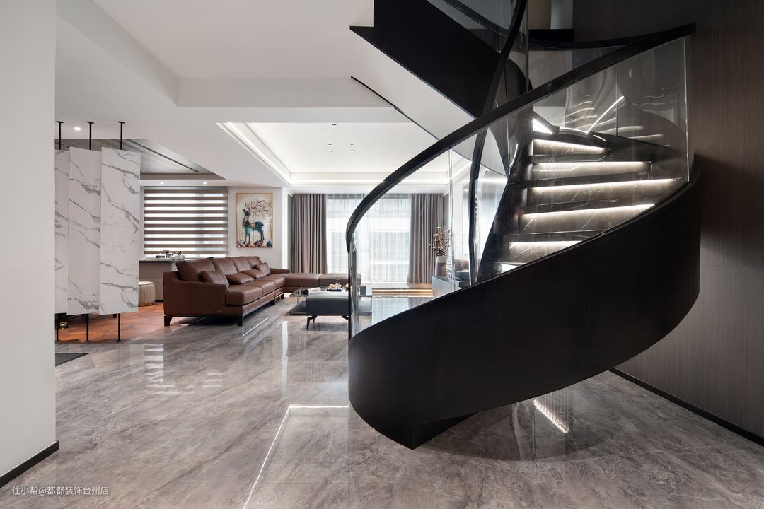 大理石旋转楼梯,酷炫时尚,营造出理性与动感、散而有序的空间体验,旋转角空间的巧妙运用,让家居空间别有味道,无形中起到了分离客厅与餐厅空间的作用,带来更加丰富而又别具一格的视觉感受。