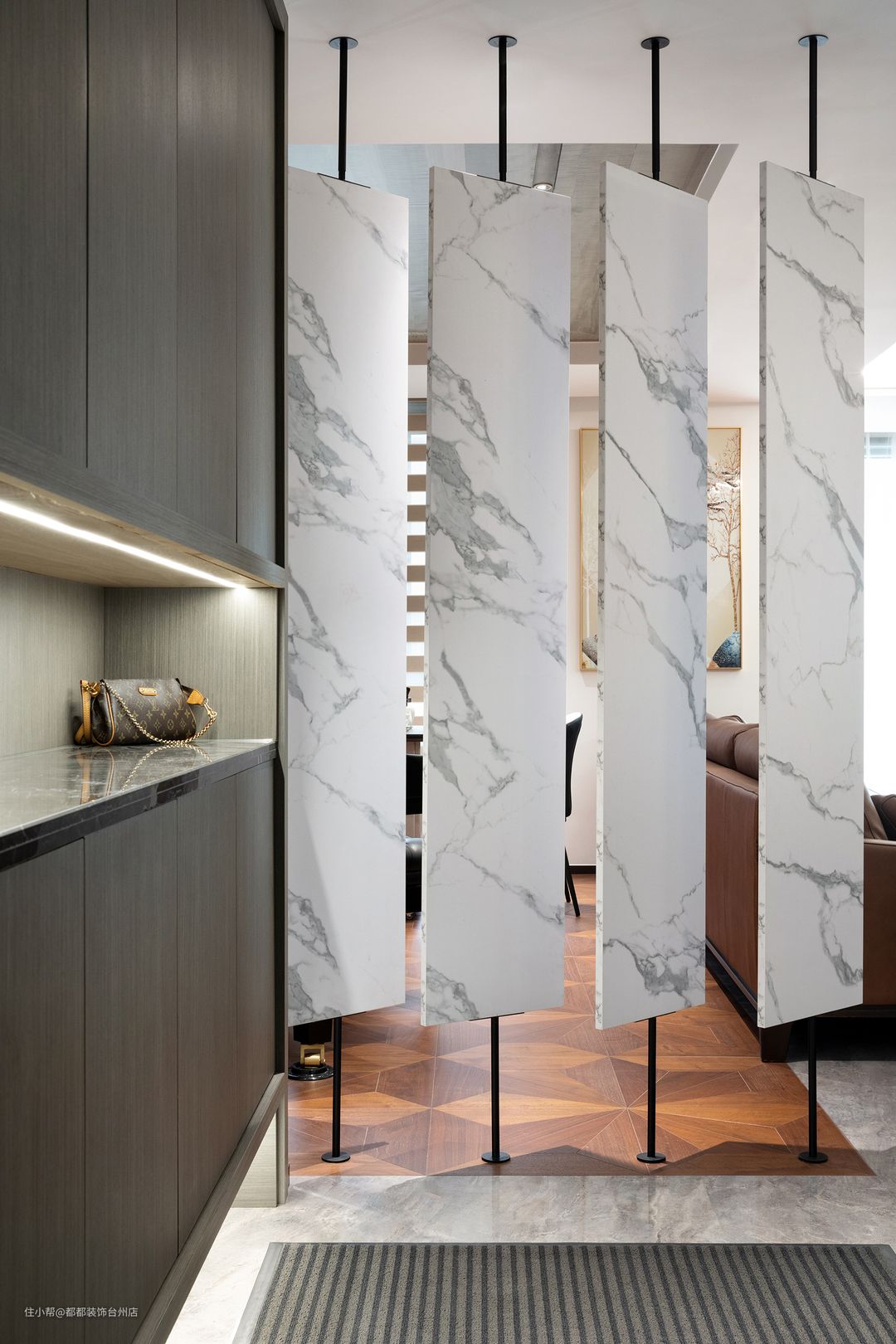棕色雅致的玄关柜集质感与实用于一身,整体对称的空间布局,陈列艺术摩登的饰品,带来“高级质感”的视觉体验,大理石隔断玄关,既保护了隐私的同时又起到分离空间的作用,给客厅增添几分神秘感。