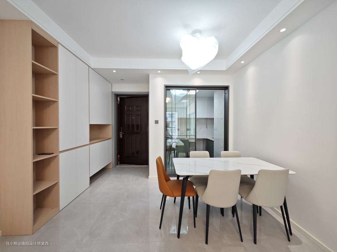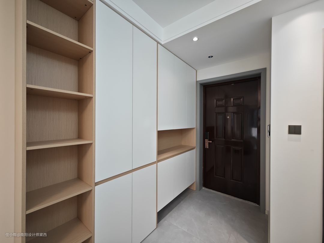 入户玄关利用空间,定制了一组收纳柜和餐边柜,宽度300mm中间留空400mm的造型设计,提升实用性,餐边柜留空区域后期搭配装饰画和花卉绿植装点,活跃氛围。