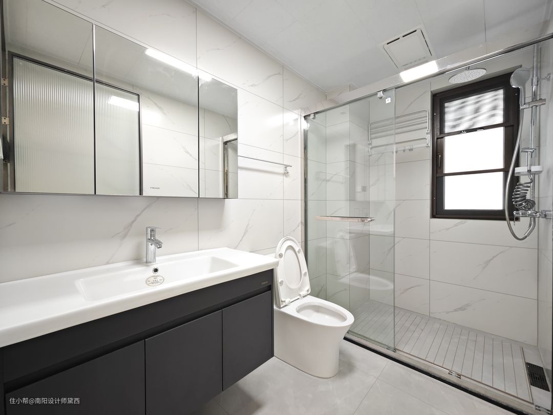 这个卫生间不简单,镜柜双开门的设计可以让两个大人同时洗漱,淋浴干湿分离,占用空间小而不窄,减轻了视觉负担的同时完美创造了不同层次的空间体验感,从此再也不用担心和老婆抢厕所啦!
