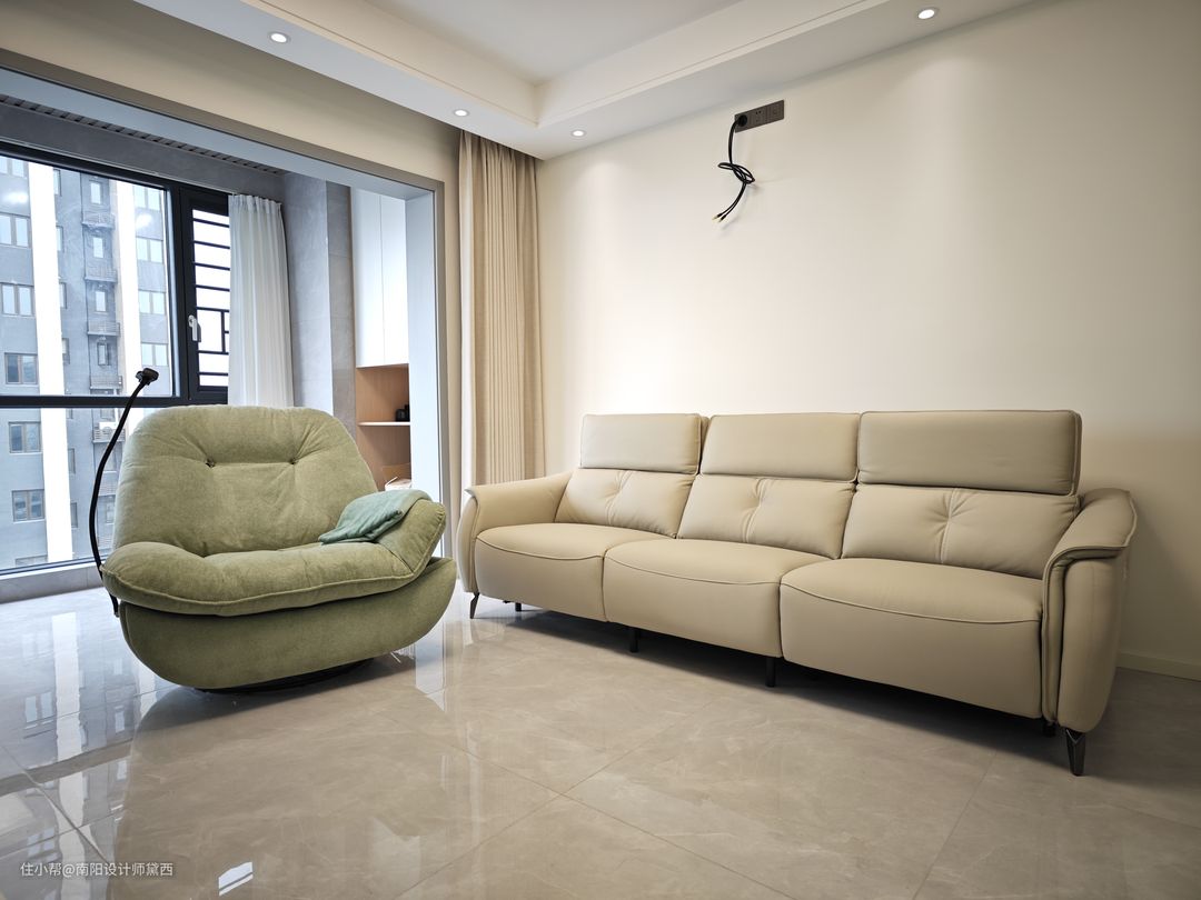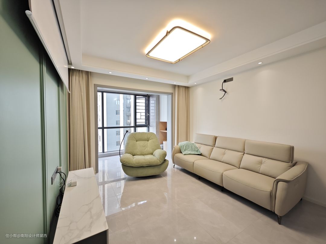 客厅墙面通刷立邦可可蛋奶乳胶漆,光线柔滑效果非常有韵味,不做硬装造型设计,既环保又省钱,住多久都不会过时,搭配浅色沙发,温馨感浓厚,豆绿色皮质沙发又让客厅眼前一亮