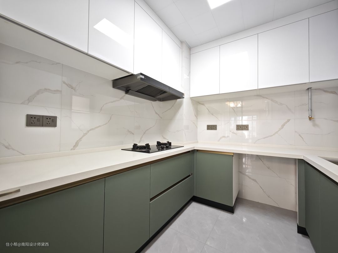 厨房的空间很宽敞,整体以浅色调为主,在视觉上提升空间感。定制U型橱柜操作台+吊柜,地柜的柜门为灰绿色,吊柜的柜门为白色,结合白色石英石台面,上下分体的色彩设计,让空间更加沉稳大气,而且结实耐用。