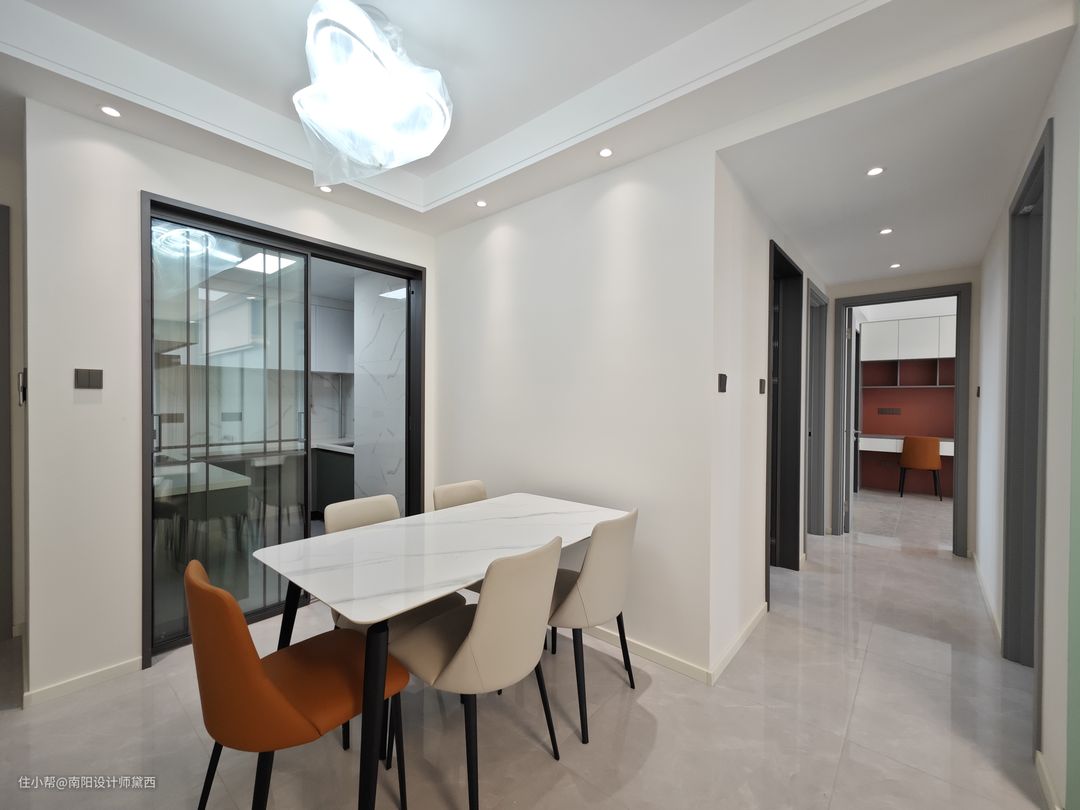 就餐区靠墙陈设一张大理石面的长方形餐桌,搭配十天餐椅,黑色的支腿搭配浅色的椅面,整体效果很有质感,正上方设计一盏双圆环的艺术吊灯营造灯光环境,而且还起到了装饰的效果。