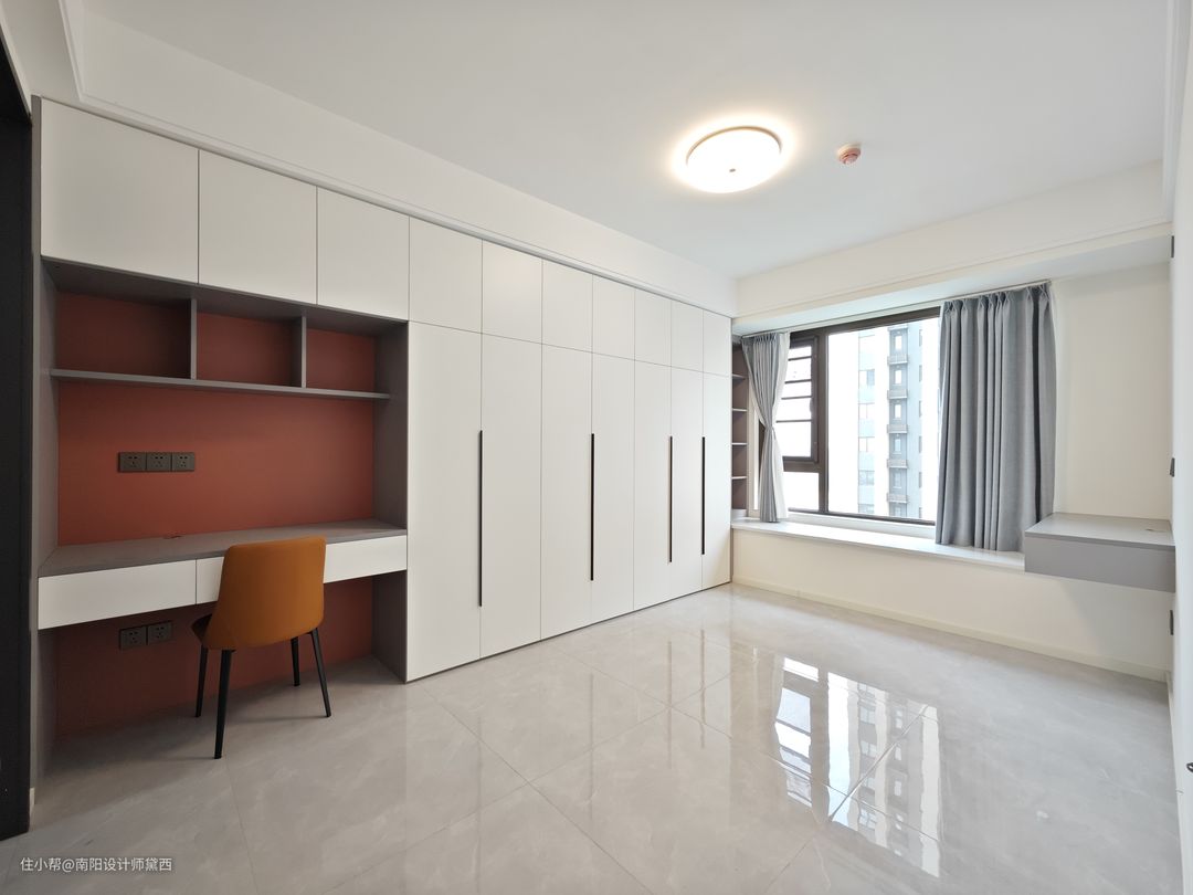 在靠墙定制了一面通顶衣帽柜,满足日常生活的收纳储物需求,整体白色的柜门结合黑色线性门把手,效果简洁大方又实用。