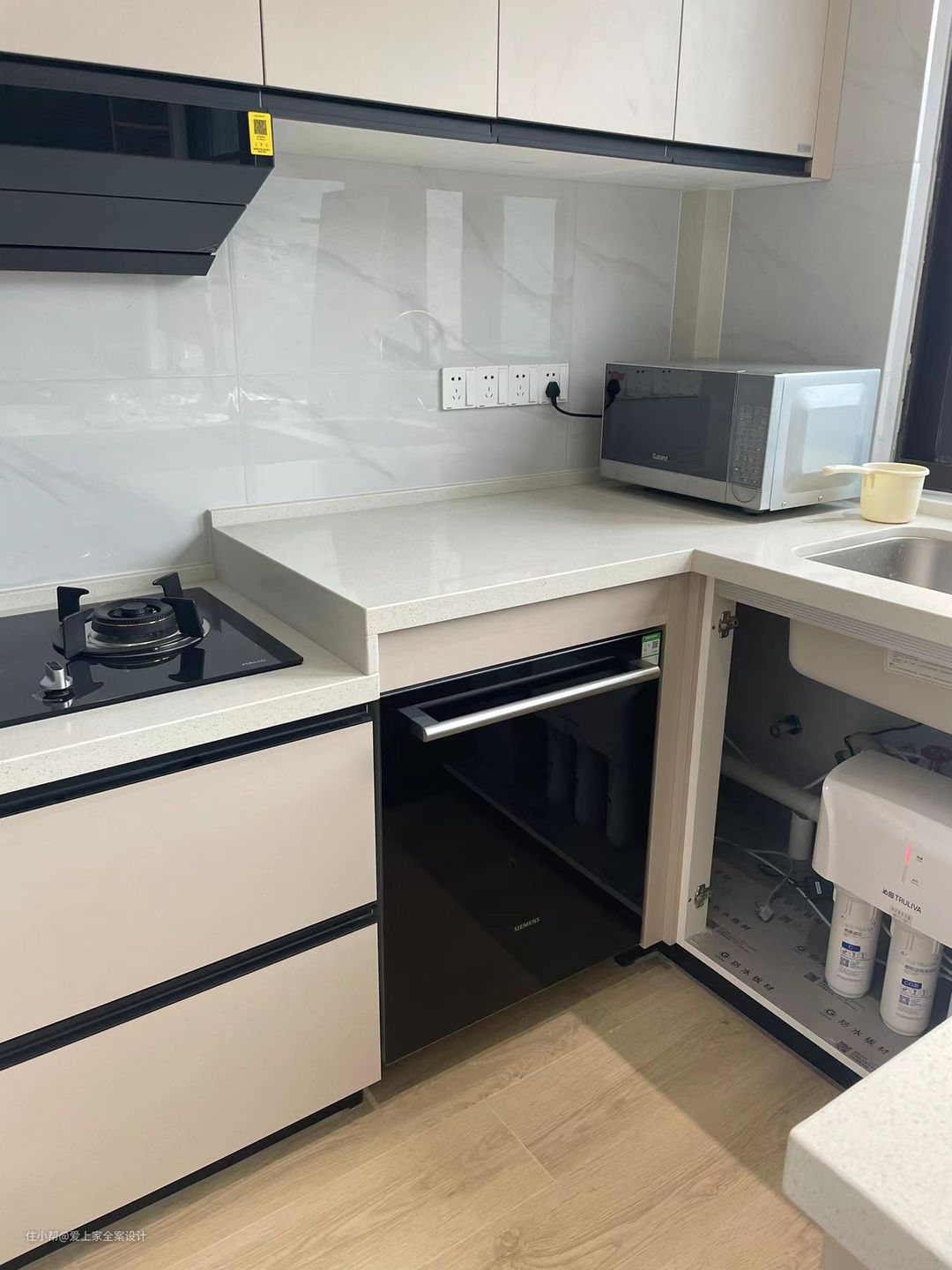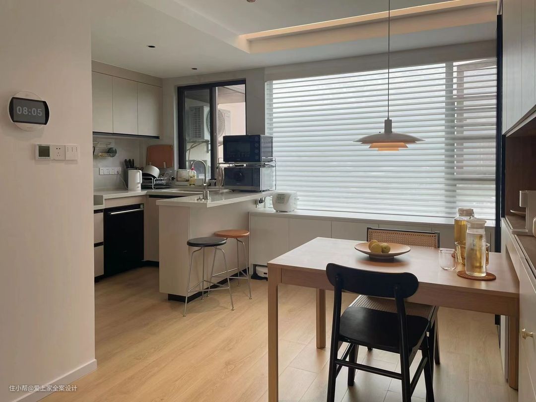 厨房我们做了岛台发的设计,哑光橱柜搭配上白色大理石台面,使得整个空间更加有质感和设计感。