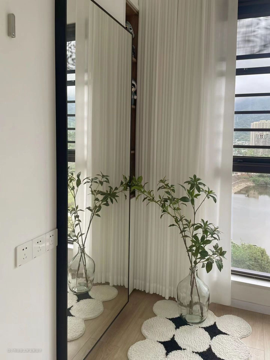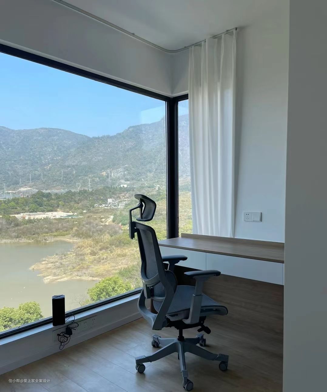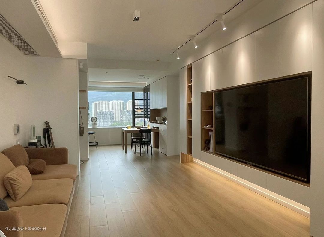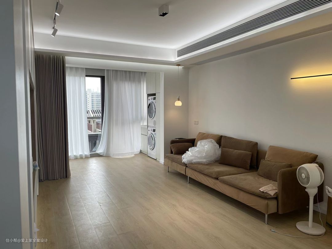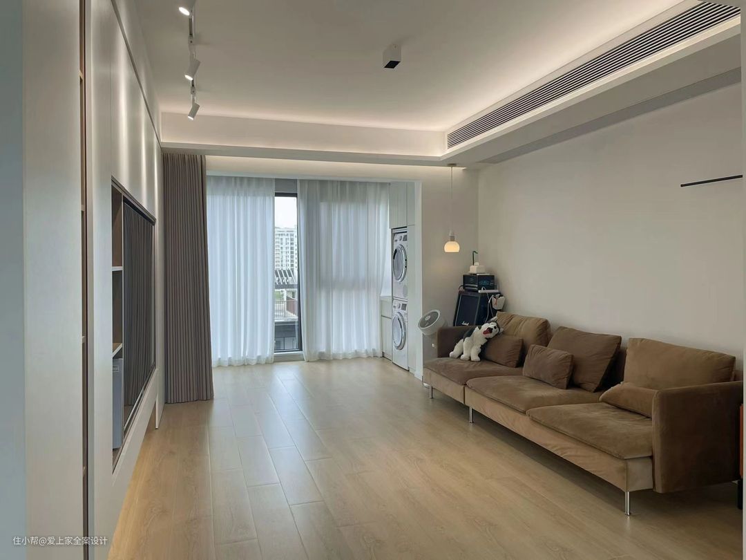 阳台我们设计了传统的洗衣区,并且吊顶做了隐形晾衣架,洗晾晒一体化,动线合理美观。