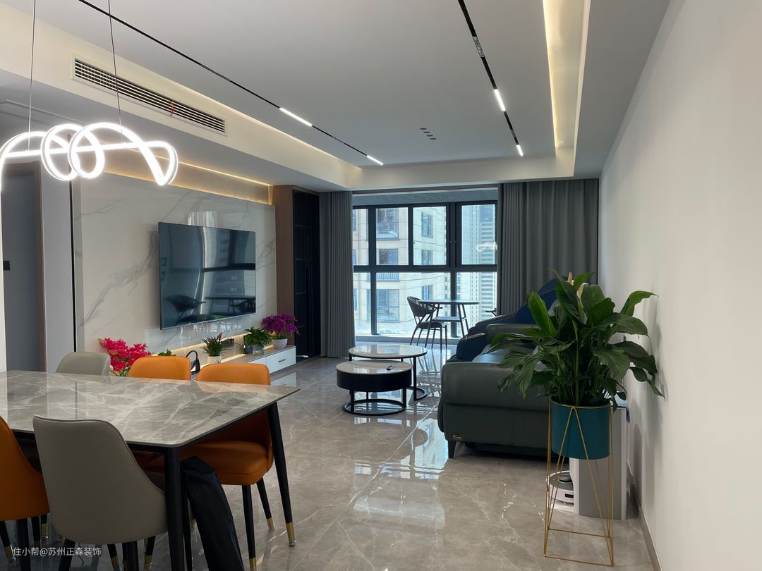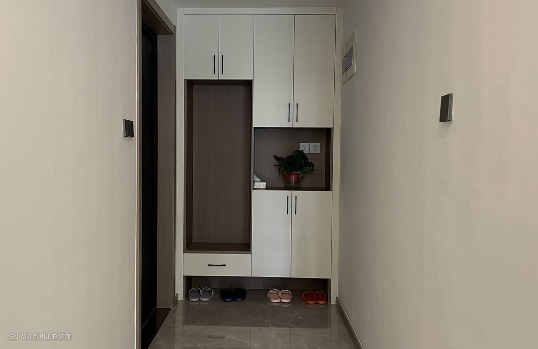 玄关 设计了上下两层的鞋柜,在鞋柜的一侧设计了衣服悬挂的区域,并且在右侧还设计了置物格,方便放置 一切物品,这样的设计既满足着了日常生活的需求,也让玄关呈现出整洁、有序和舒适的氛围。 客厅 采用了亮面瓷砖通铺的设计,搭配上深绿色皮质沙发的设计,不仅为整个空间注入活力,还能带来意思清新的气息,悬空的电视背景墙和电视柜的设计既美观又实用,使得整个空间更加开阔,为了营造出温馨和舒适的氛围,整个客厅采用的是线灯以及局部氛围灯的设计,增添了整个空间的美感。