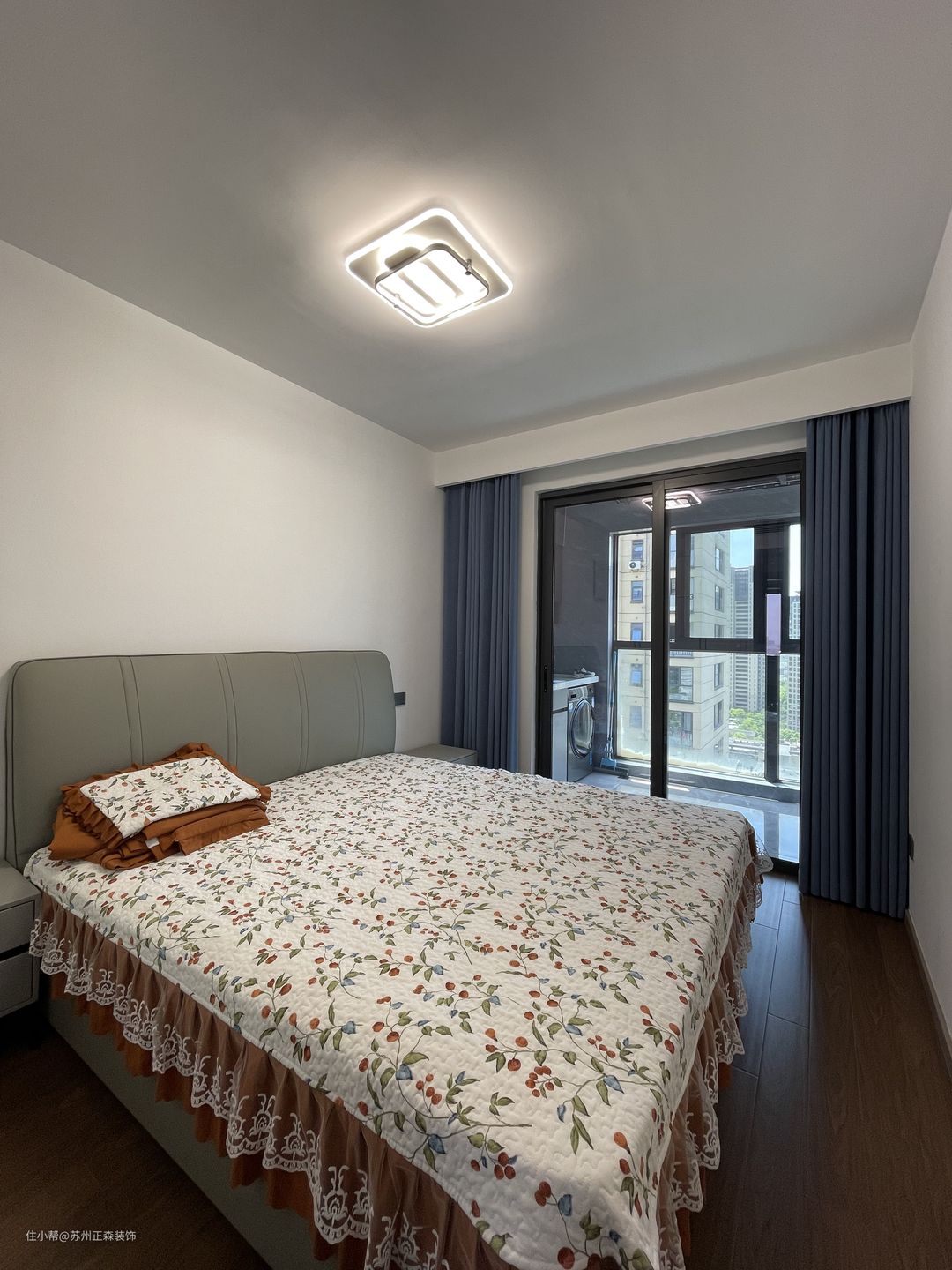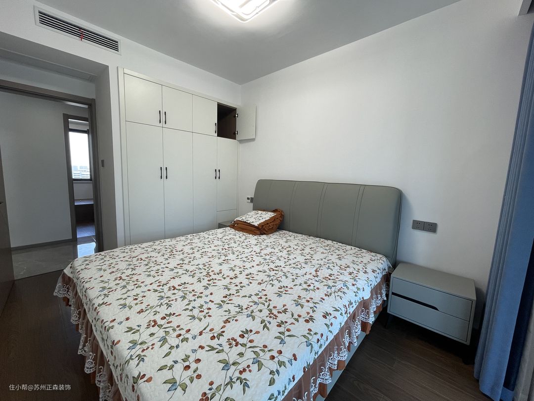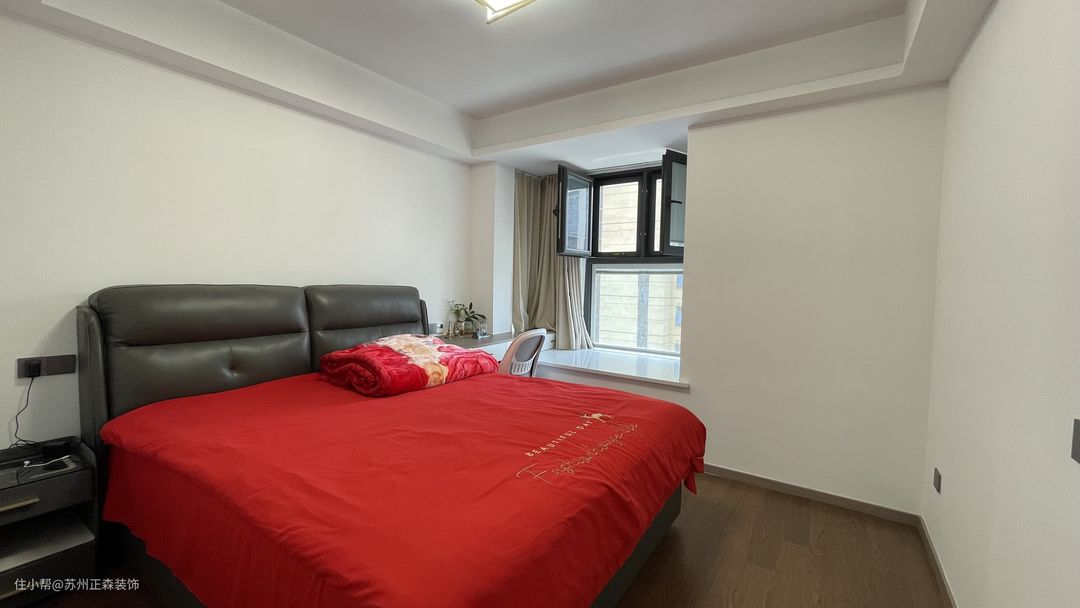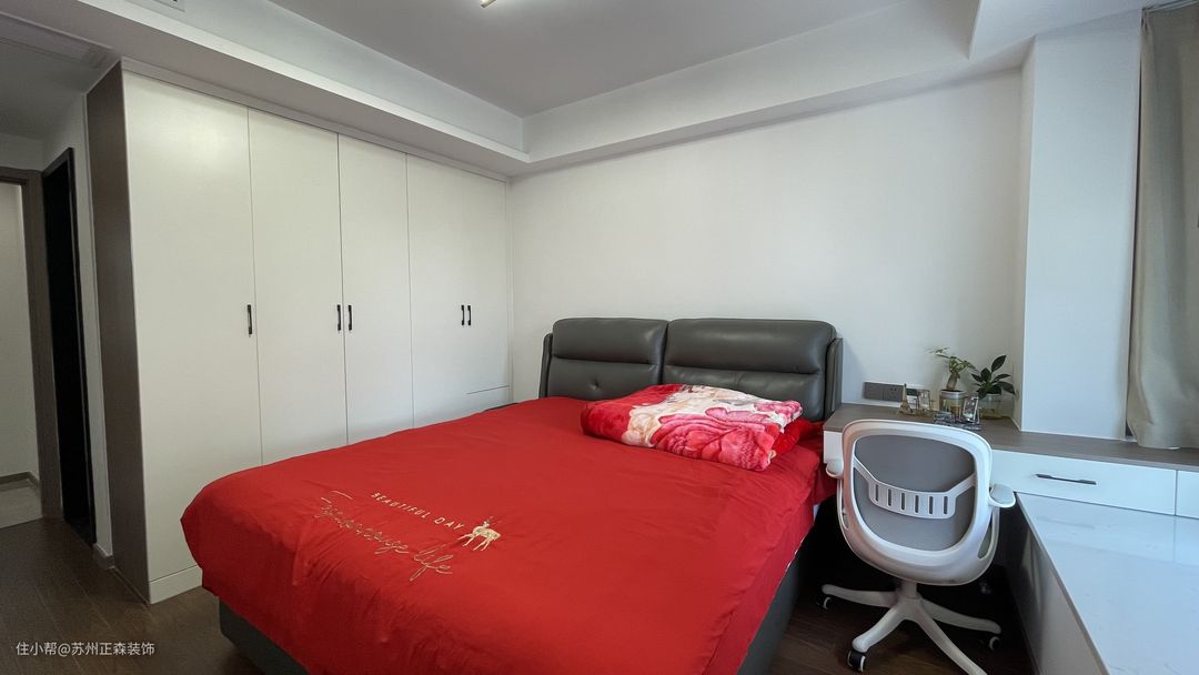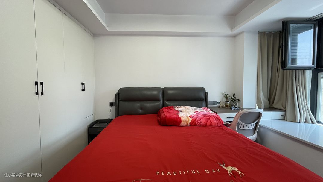 主卧 铺设的是深色的木质地板,为整个房间增添了一份沉稳和舒适,搭配上白色的衣柜,为整个卧室增添了一份明亮和整洁的感觉,并且在飘窗的一侧还延伸出一张化妆桌,提供了一个舒适方便的空间。