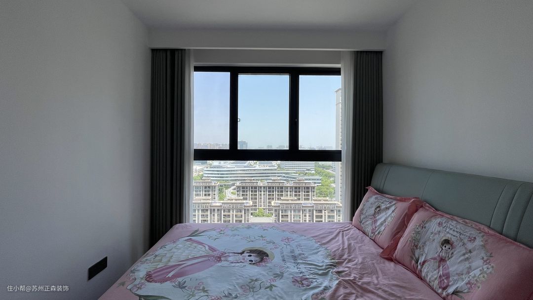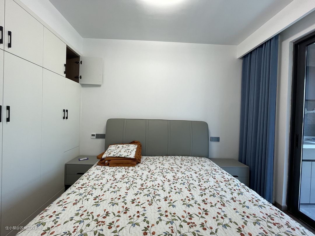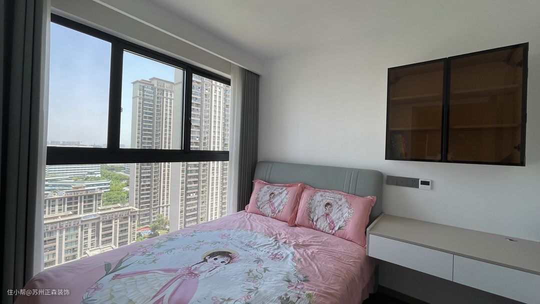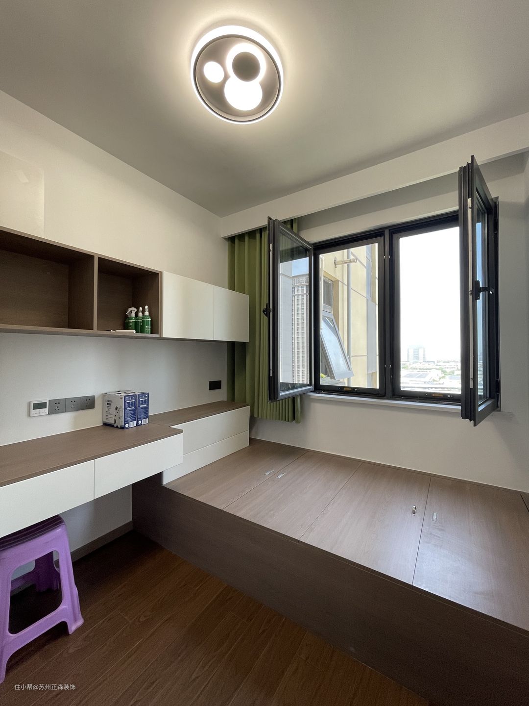 次卧 为了打造通透明亮的空间,将次卧的阳台与客厅的阳台打通的色剂,不仅增加了室内的采光和通风,还提供了更大的视觉空间,在地面铺设的是深色的木质地板,为整个房间增添了一份沉稳和质感,搭配上纯白色的衣柜,为整个房间增添了一份垂直的美感。 儿童房 采用了落地窗的设计,为整个空间带来了充足的光线和开放感,悬挂式的书桌和书架,不仅可以节省空间,还提供了专属的学习和创作区域,搭配上白色的衣柜,为整个空间增添了明亮和征集的氛围。 多功能房间 悬挂式书架搭配上榻榻米的设计,既节省了空间又提供了舒适和实用性,并且在榻榻米的一侧还巧妙的眼神出一张书桌,提供了安静的学习或工作空间。