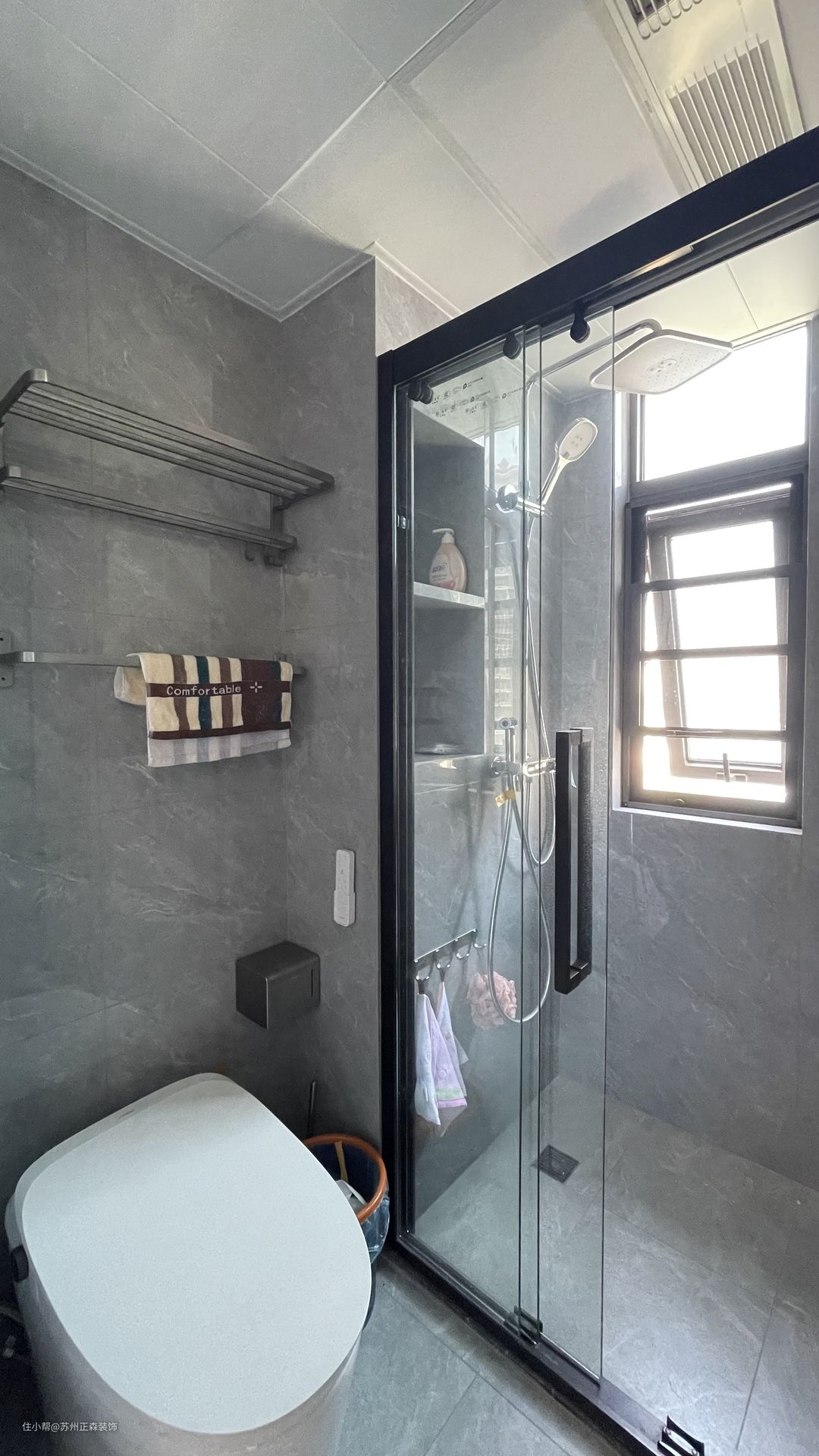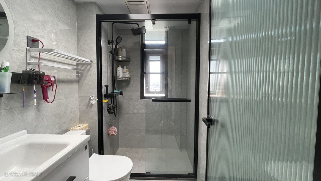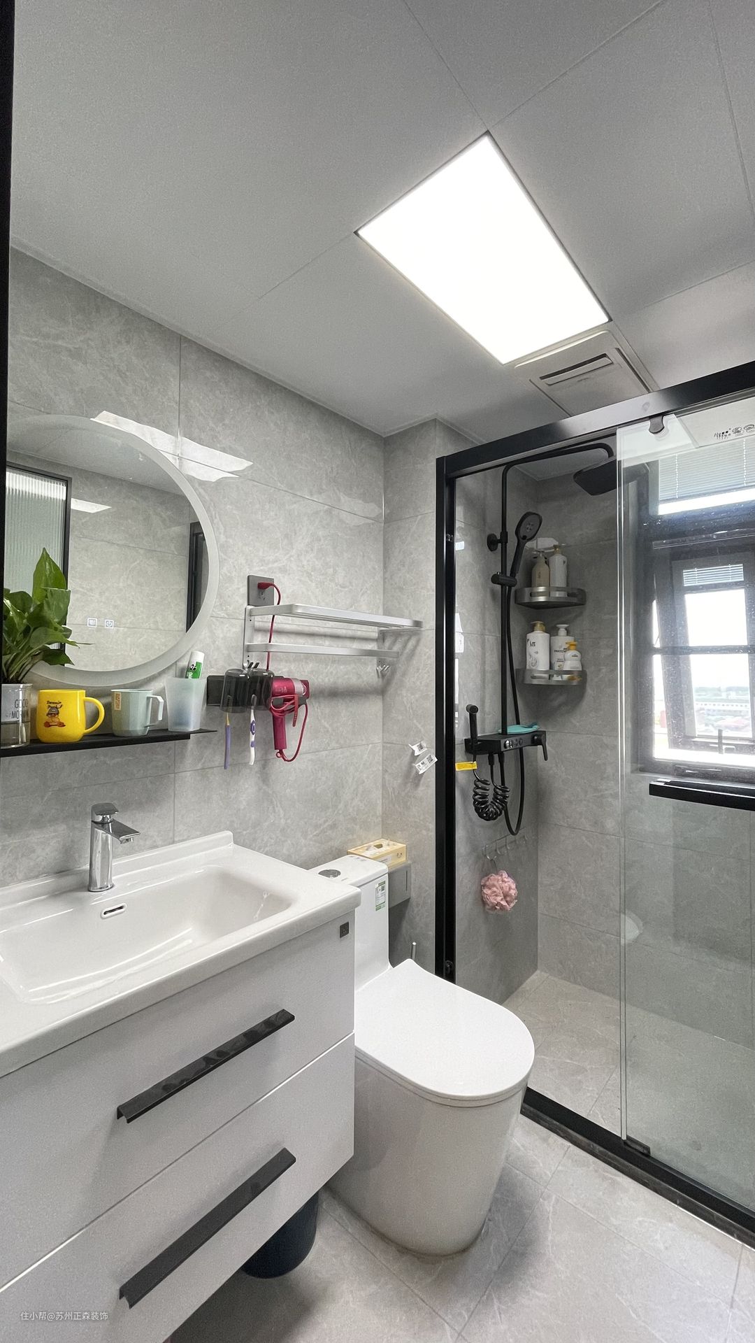 卫生间 采用了干湿分离的设计,巧妙的用一个玻璃移门将淋浴区和洗漱区分隔开,不仅为整个空间增添了现代感和时尚感,还让整个空间更加明亮通透,搭配上悬挂式的白色洗漱台盆,营造出一种清爽干净的氛围。